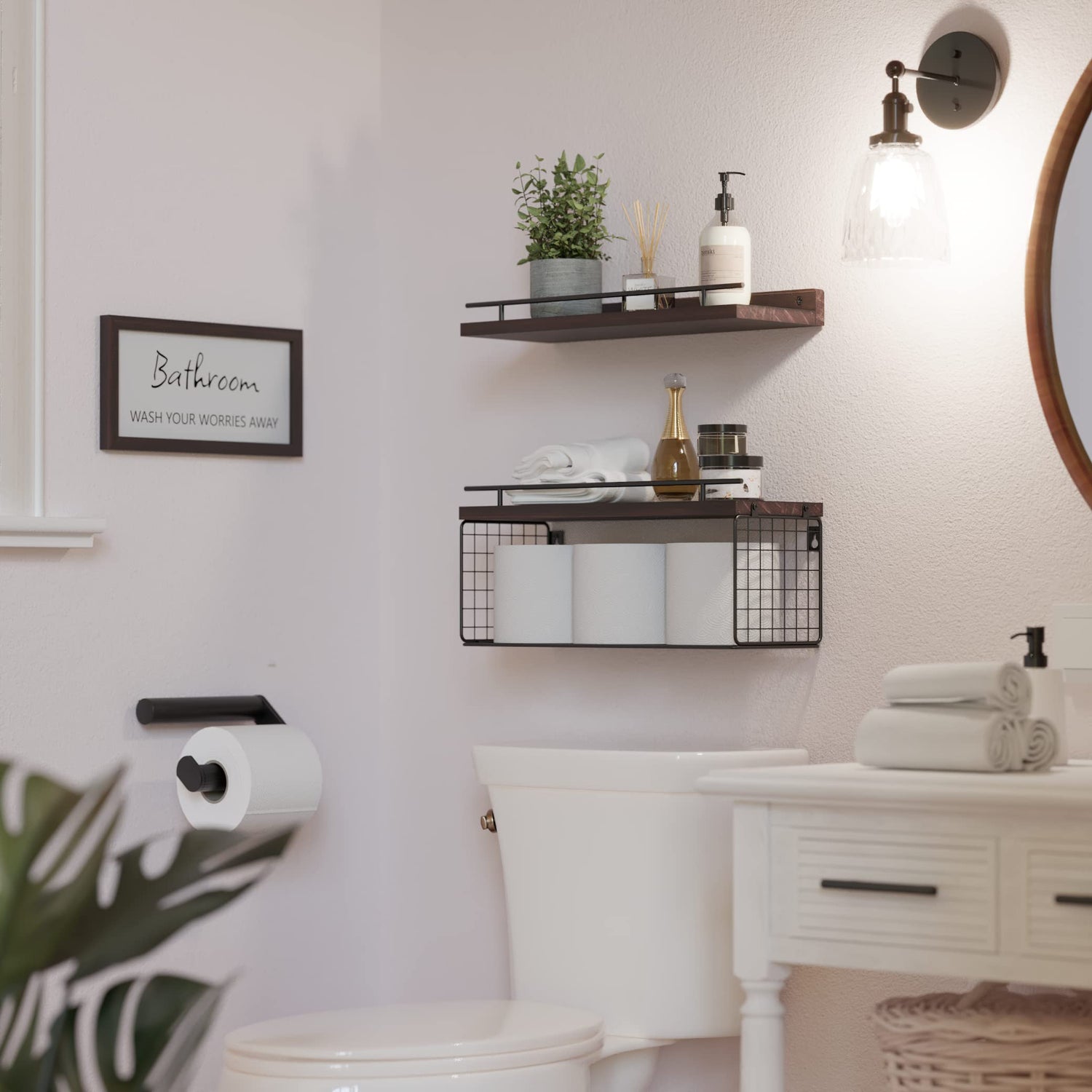 - 2-in-1 Floating Shelves with Toilet Paper Basket - The size of the bathroom floating shelves basket is 15.7*6*5.5 inches, which can store 3 rolls of toilet paper, other small objects, and towels. Our storage basket of floating bathroom shelves is made of iron wire with a powder-coated finish, which is more solid and won’t rust. It fits the humid environment. These wall-mounted floating shelves with a grid design will reduce dust accumulation, and keeps the toilet paper clean and dry.