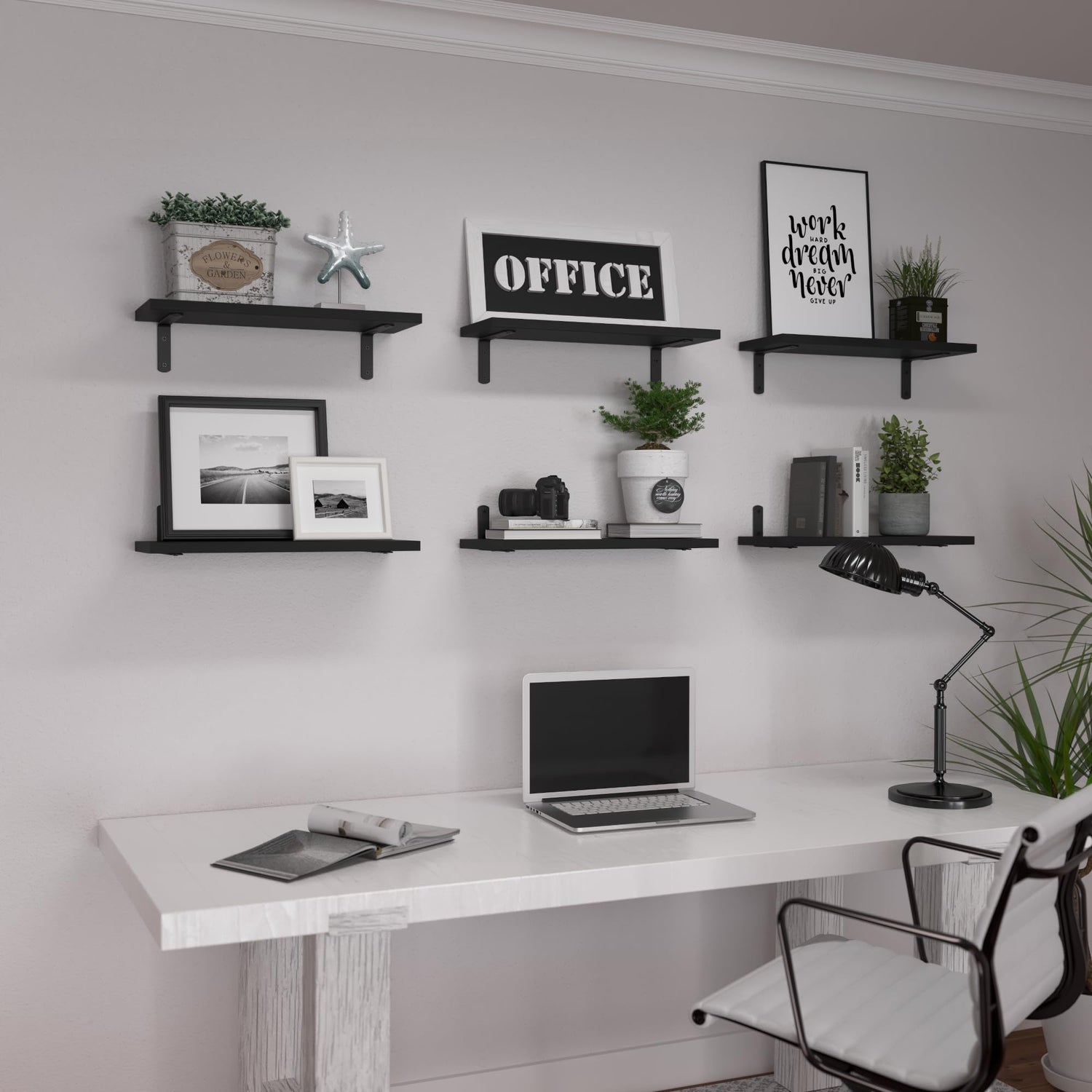 - Rustic Farmhouse Style - Our farmhouse style rustic black floating shelves for wall decor measure 16.5*6*0.6 inches, which can provide an extra storage space wherever needed. WOPITUES floating wall shelves fits rustic/modern farmhouse style, traditional/industrial style, vintage style, or minimalist style home décor. Add some warm and sweet atmosphere to your bedroom, living room, bathroom, office, and kitchen. You can use it as a corner shelf, floating plant shelf, book shelf, and cat shelf.
