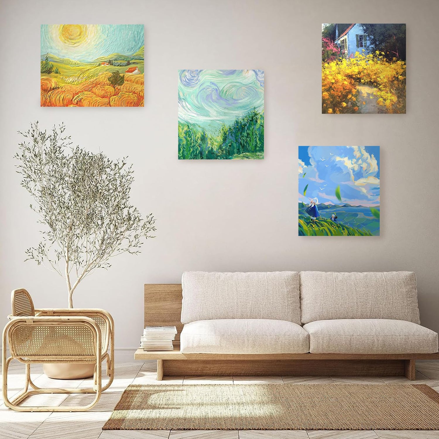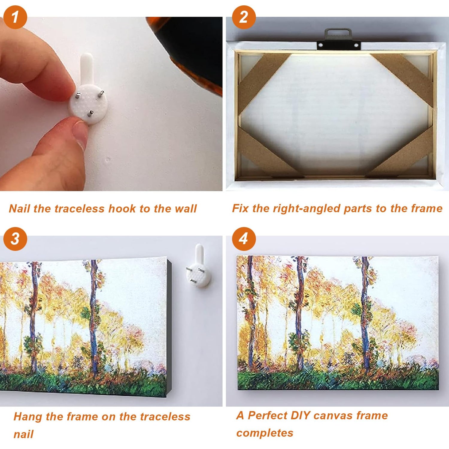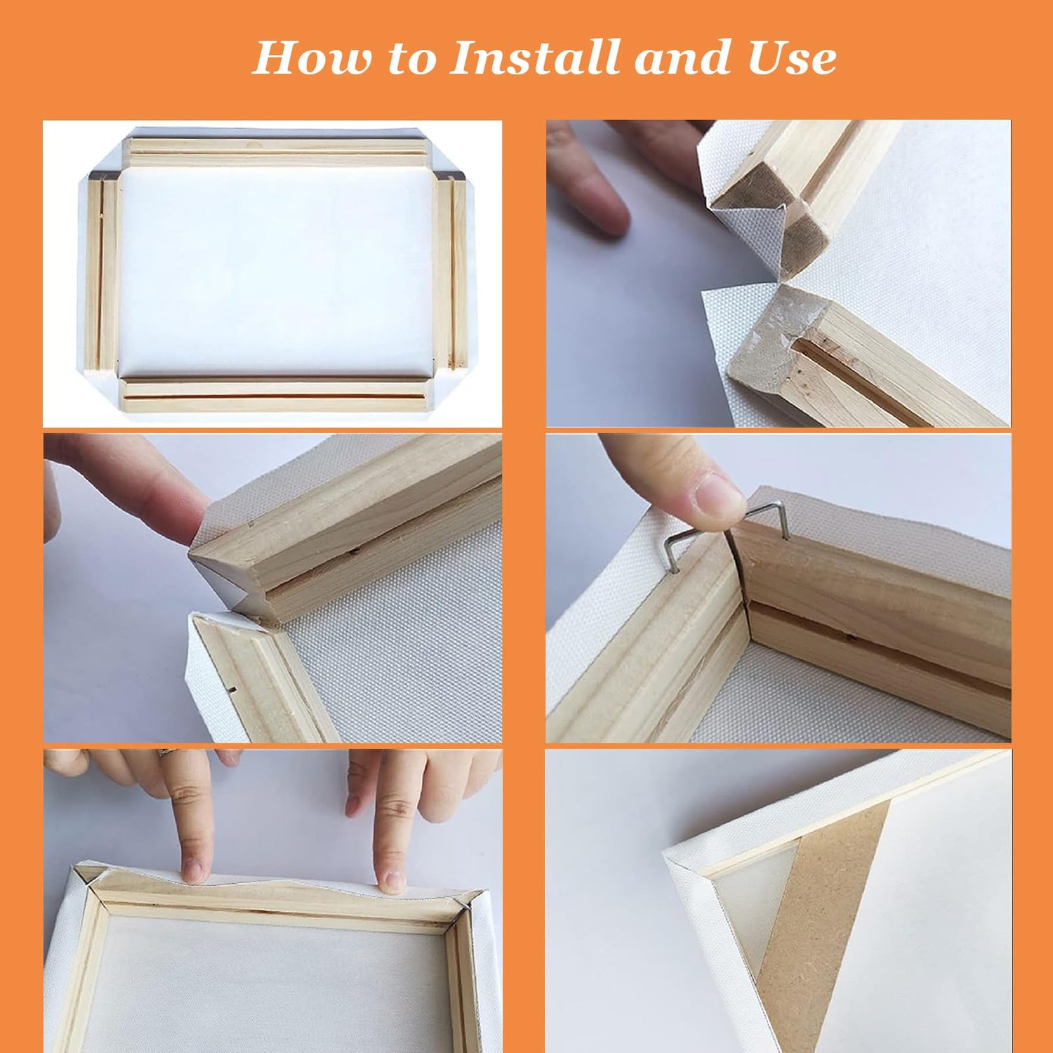 - EASY ASSEMBLY: Canvas stretcher frame installation is very simple, first remove the adhesive on the stretcher, and then assemble the four rods together, fix the four corners with a fixed iron, and then insert the wooden board into the four corners, you can assemble into a canvas picture frame,Please refer to the picture for details