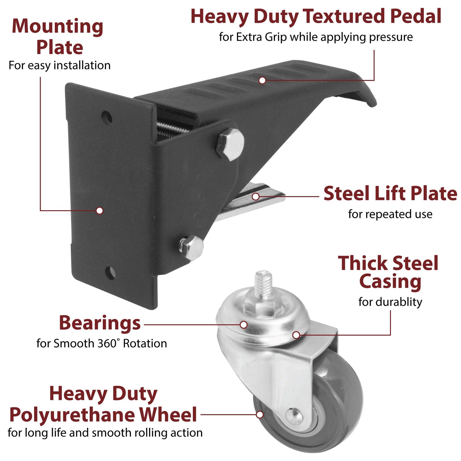 - Each lift pedal is ribbed and textured to provide extra grip when foot pressure is applied. The 2-3/8” urethane casters are rated for 210 lbs of capacity, which means all four together give you a total weight capacity of 840 lbs. The casters will work on most workbenches, stands, tables, cabinets and lightweight machinery with flat bases.