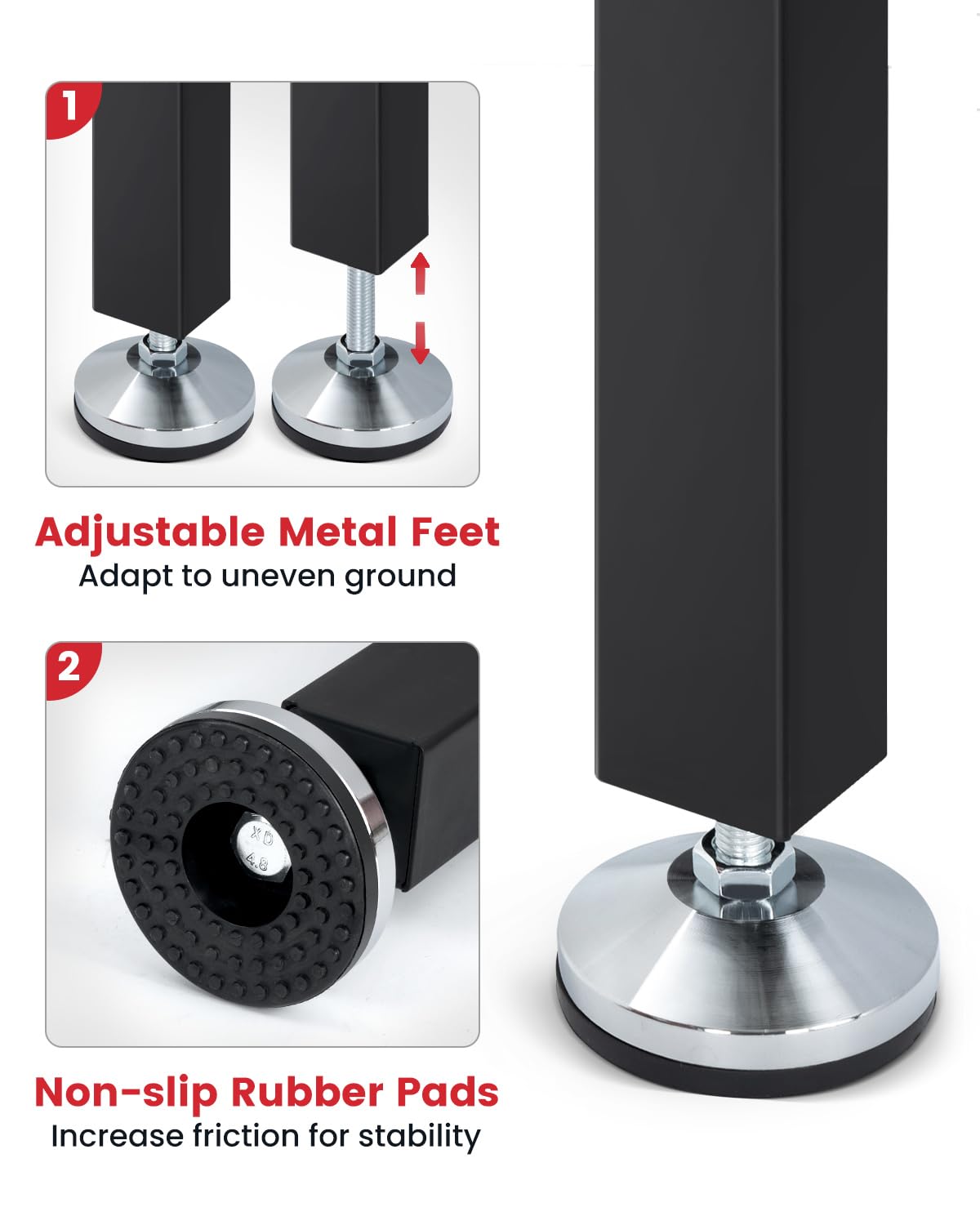- ๐๐๐ฃ๐ฎ๐ฌ๐ญ๐๐๐ฅ๐ ๐ฆ๐๐ญ๐๐ฅ ๐๐๐๐ญ, adapt to uneven ground to maintain stability. Anti-slip silent rubber pad increase friction for stable and safe.