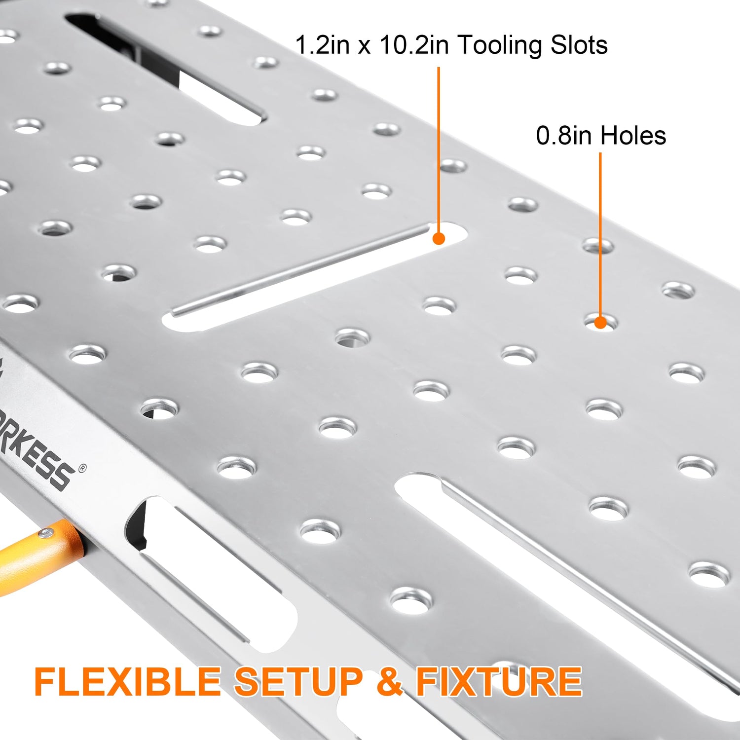 - LARGER WORKSPACE, FLEXIBLE FIXTURE: Features a 42" x 21" welding table top with strategically located 0.8" holes and multiple slots, offering versatile mounting and clamping points to accommodate projects of varying sizes.