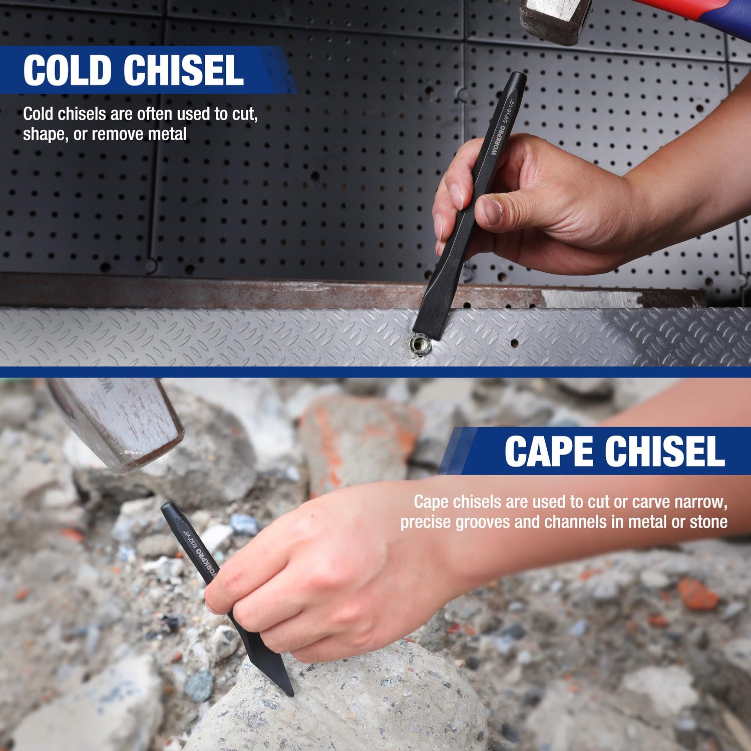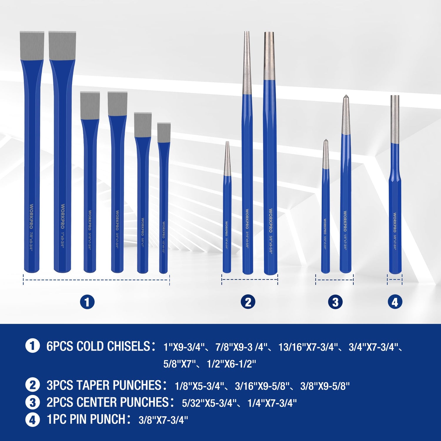 - 12-Piece Punch and Chisel Set: The 12-piece set is made of carbon steel, including 6 cold chisels, 3 taper punches, 2 center punches for metal, and 1 pin punch to cover a wide range of applications