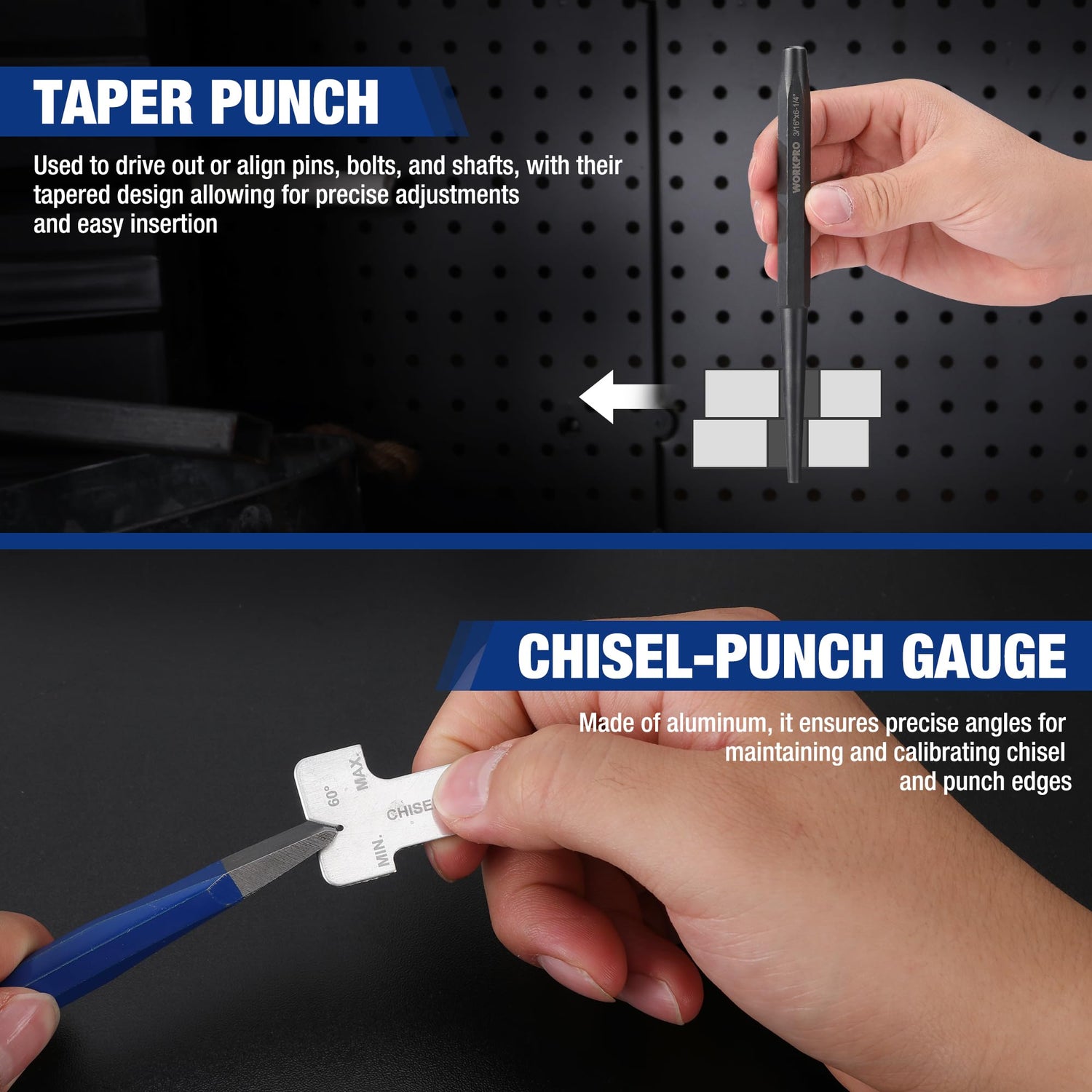 - 18-Piece Punch and Chisel Set: The 18-piece set includes alloy steel tools, such as 3 cold chisels, 2 center punches, 6 pin punches, 1 cape chisel, 5 taper punches, and an aluminum chisel-punch gauge for precise measurements