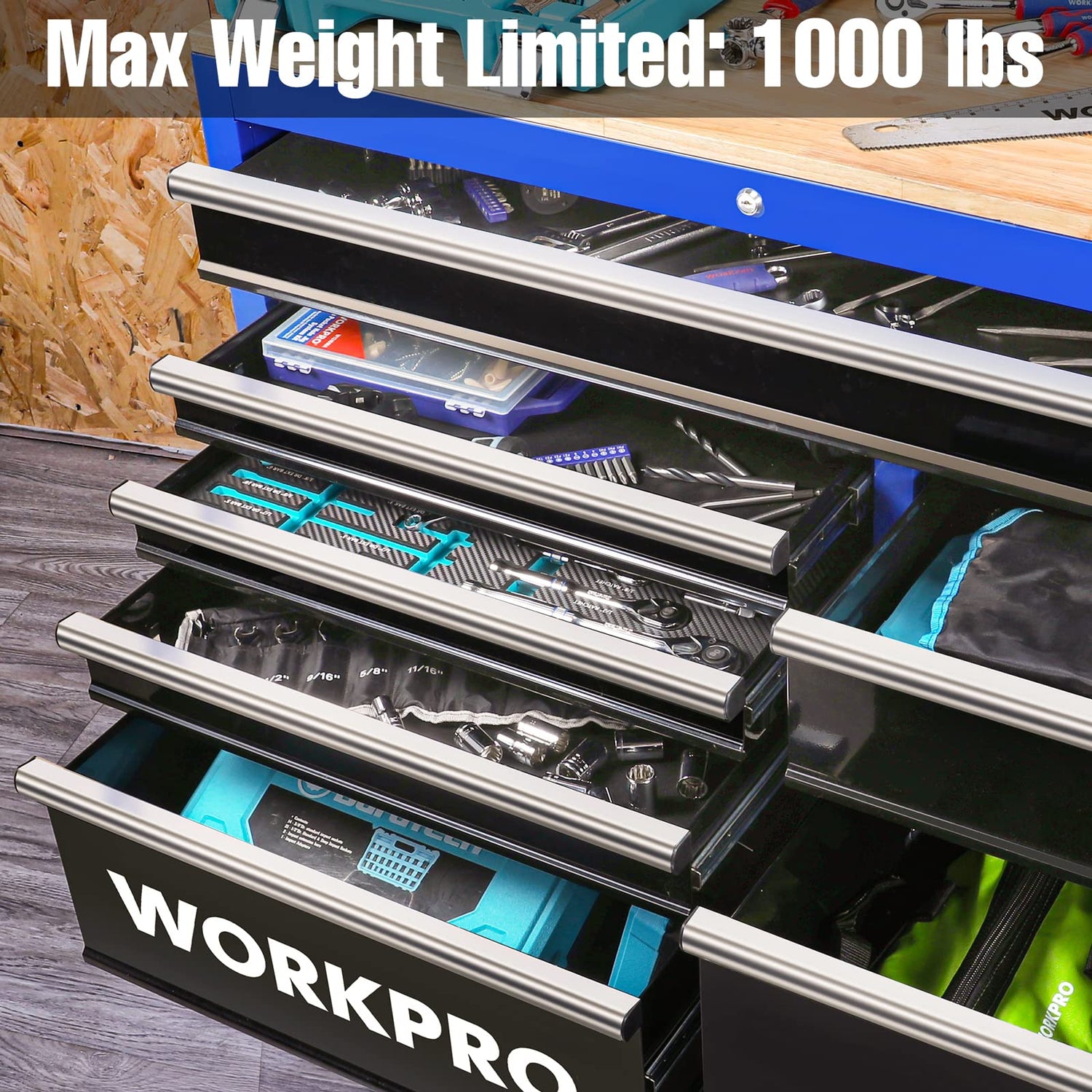 - 【Up to 1000 lbs Load Capacity】 Constructed with high-quality welded steel construction, anti-rust treatment and corrosion-resistant powder coat finish, featuring a solid-wood surface on top, this WORKPRO tool chest is a great garage tool chest or workbench that fits just as easily in the home shop of any DIYer, maker, or hobbyist. Maximum Load Bearing: 1000 lbs.