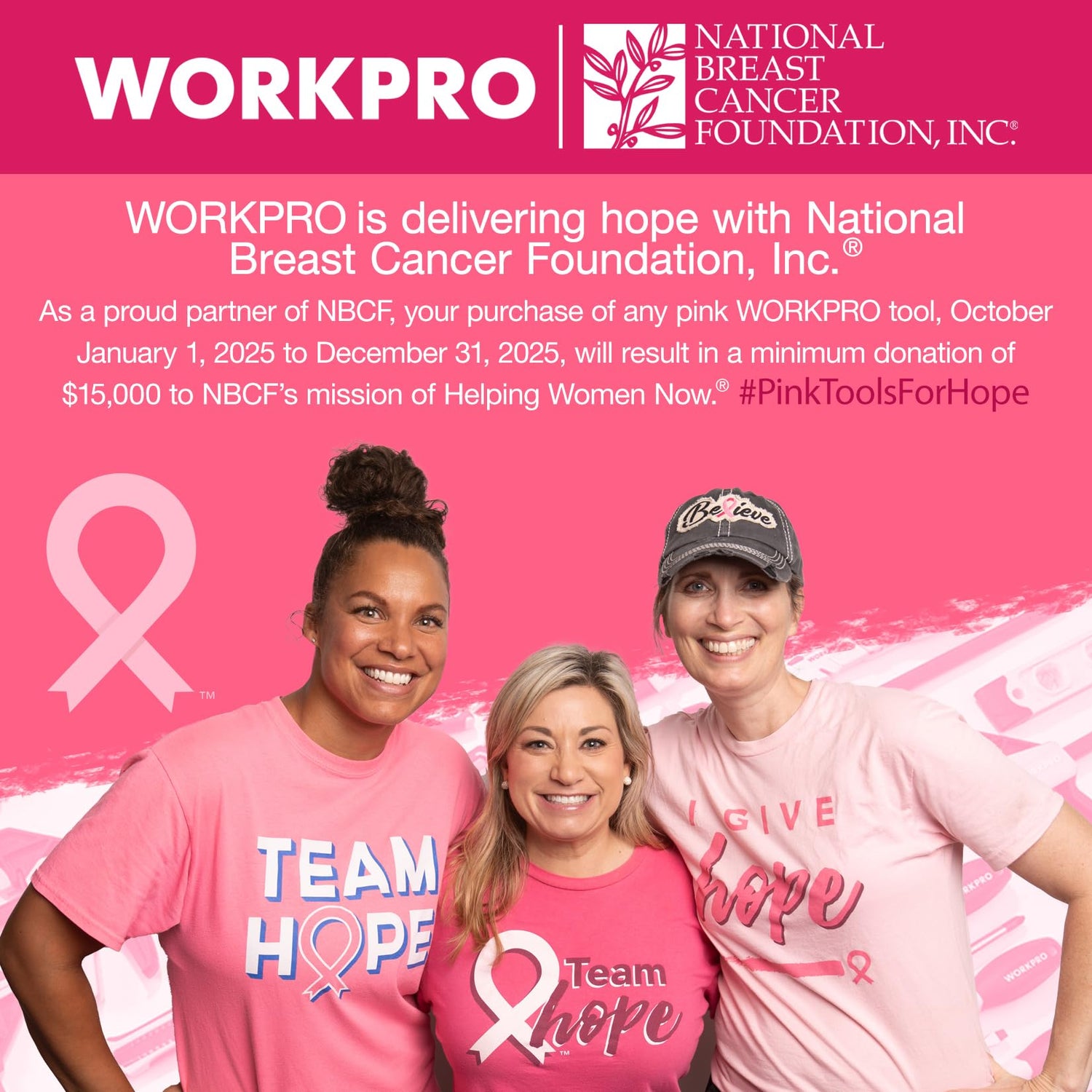 - PINK RIBBON: WORKPRO Tools is donating $0.10 from this purchase to NATIONAL BREAST CANCER FOUNDATION, INC.. NBCF is Helping Women Now by providing early detection, education and support services to those affected by breast cancer