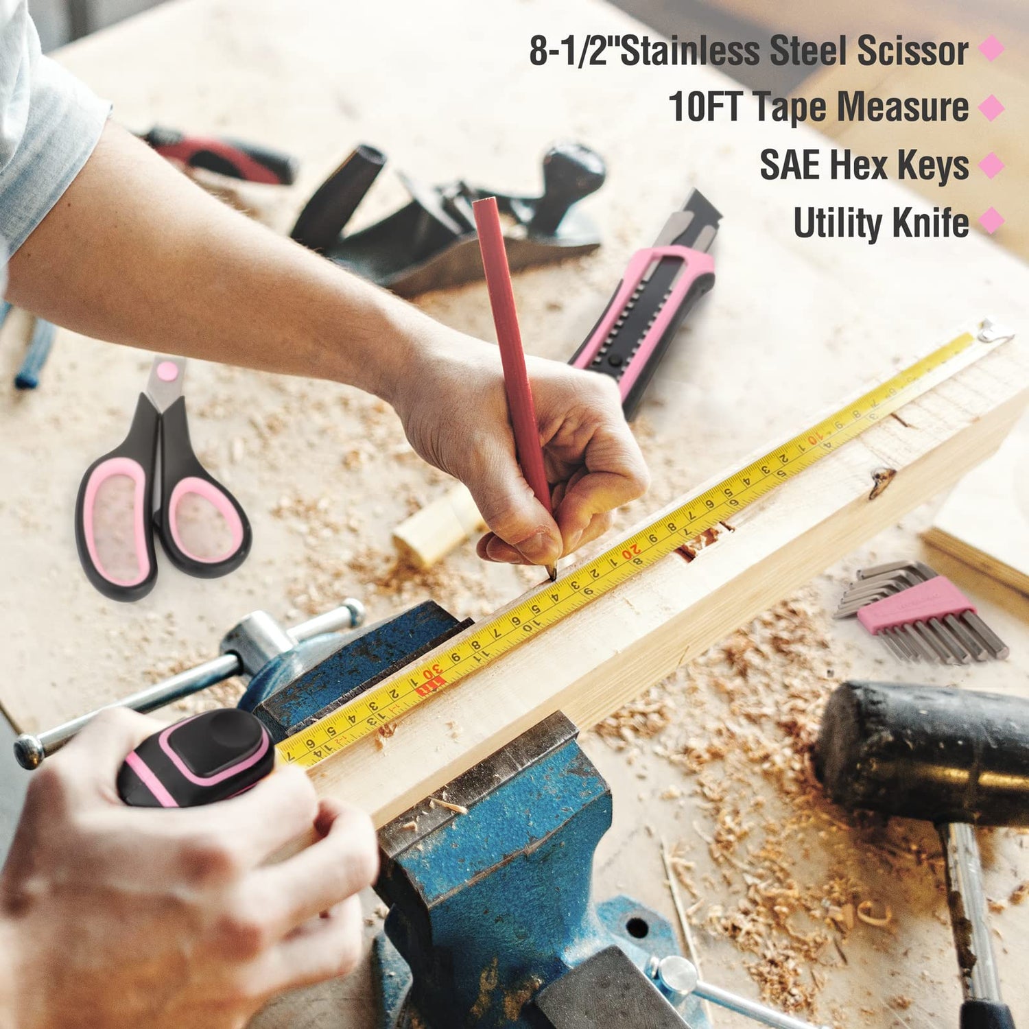 - 52-Piece Pink Tool Set - This hand tool kit has all the most useful and necessary tools for home maintenance and daily use. Tool set includes claw hammer, tape measure, pliers, magnetic screwdrivers and bits, adjustable wrench, utility knife, scissor, hex keys, and much more