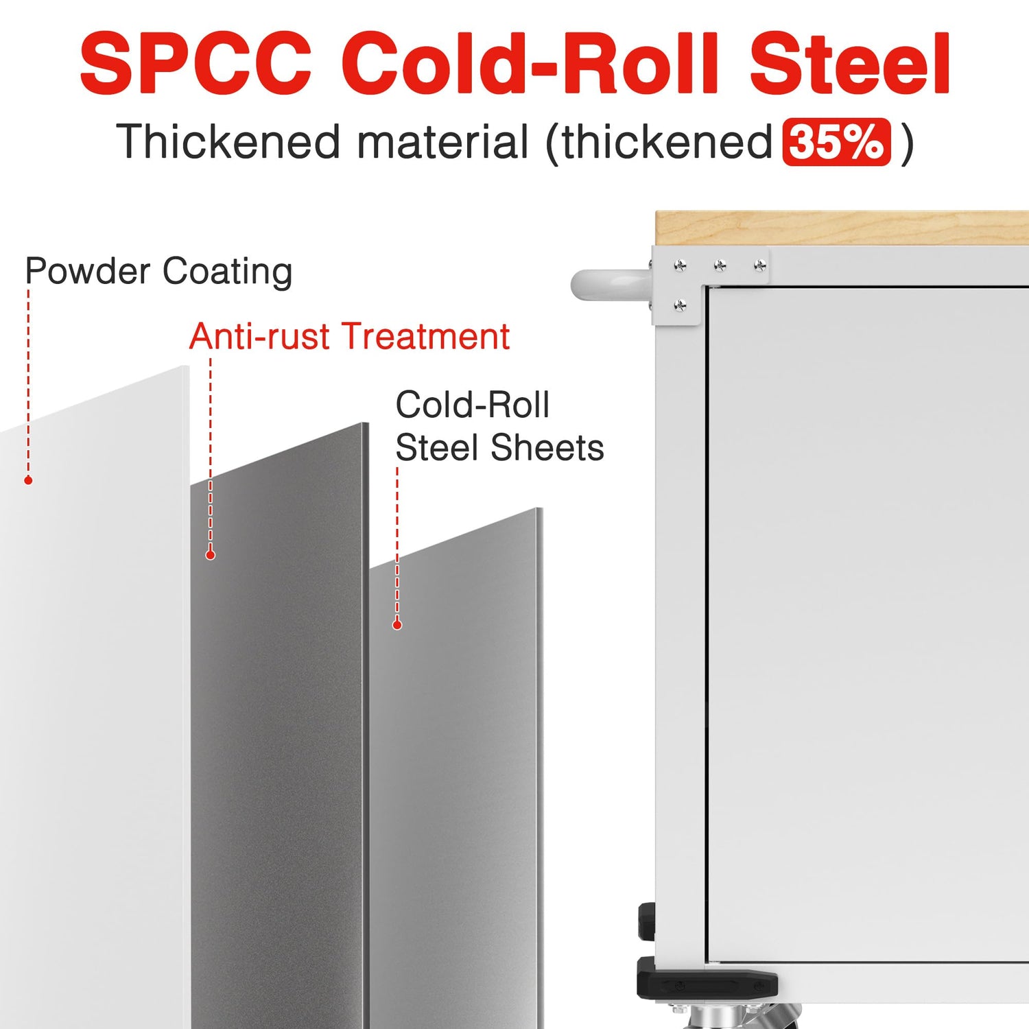 - High Load Capacity and Durability: Crafted from thick, high-quality steel plates, this rolling cabinet workbench boasts a sturdy structure and a powder-coated surface for easy cleaning and maintenance. At the top, a solid 1-3/8-inch thick wooden workbench provides a robust workspace that significantly enhances efficiency. With a maximum load capacity of 1000 lbs, it effortlessly supports a variety of tools and equipment.