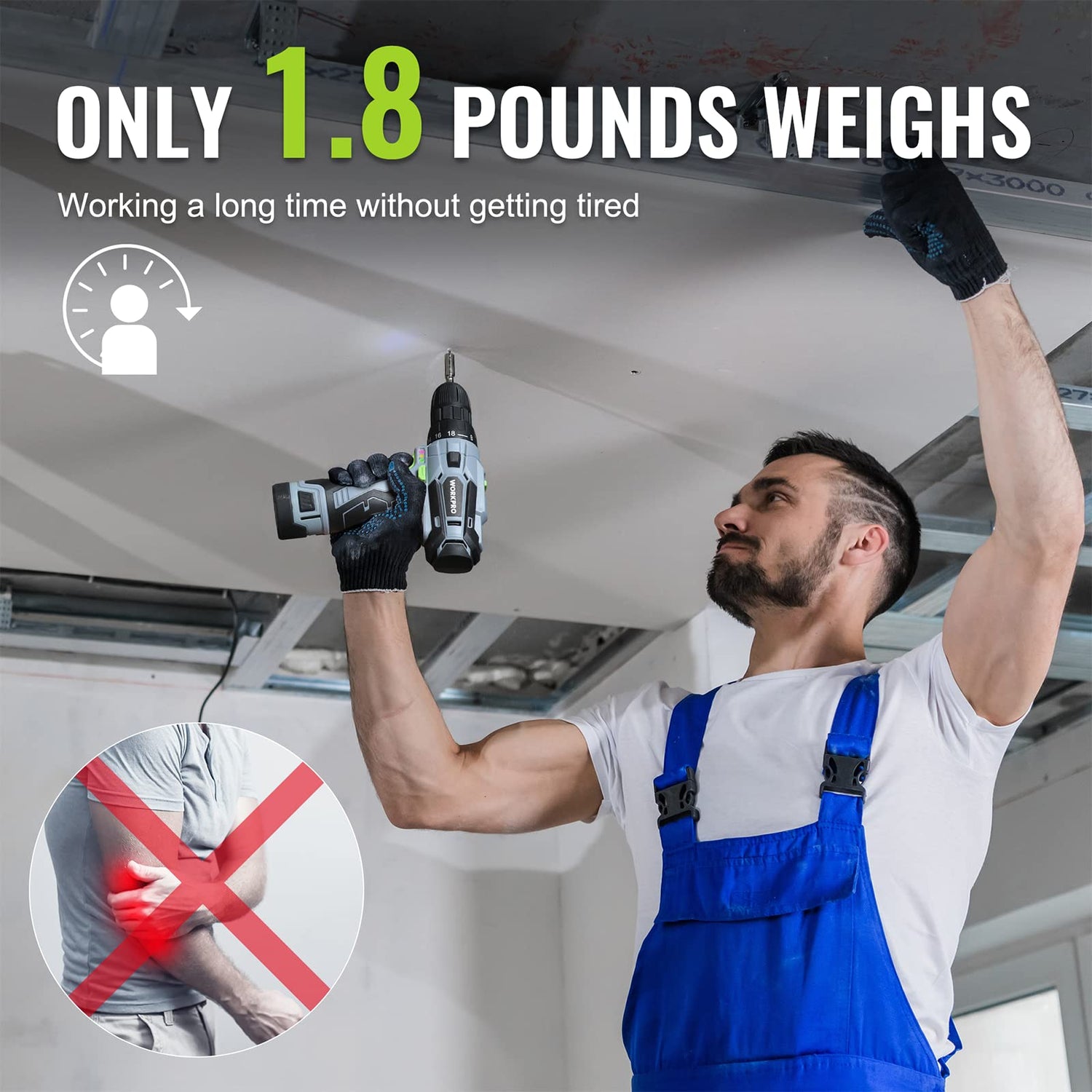 - Super Safe & Lightweight & Ergonomic: Our lightweight drill is built especially small and light ( only weighs 1.8 lb. ) and comes with an ergonomic and comfortable handle so women and smaller men can easily use it. Being so small and compact also helps make it maneuverable and easy to use in tight spaces. Trigger-activated LED light for extra security and safety when you work in dark areas