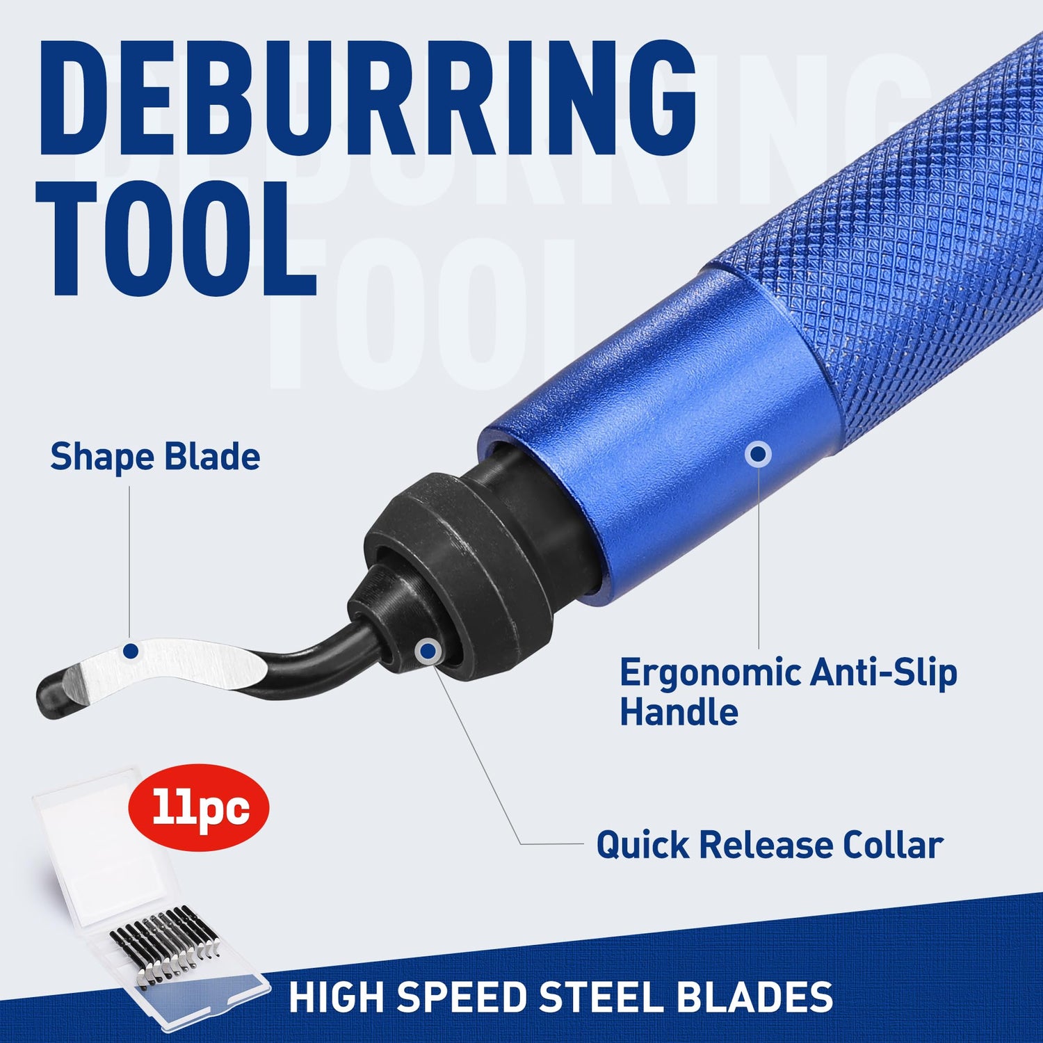 - Versatile 11-Blade Kit: Our WORKPRO deburring tool kit includes 11 mixed blades in 3 different sizes, covering all your deburring needs. The kit consists of 5 BS1010 blades for steel, aluminum, and plastic; 3 BS1018 blades for harder materials like stainless steel; and 3 BK3010 small blades for deburring tiny holes as small as 1.5 mm in diameter