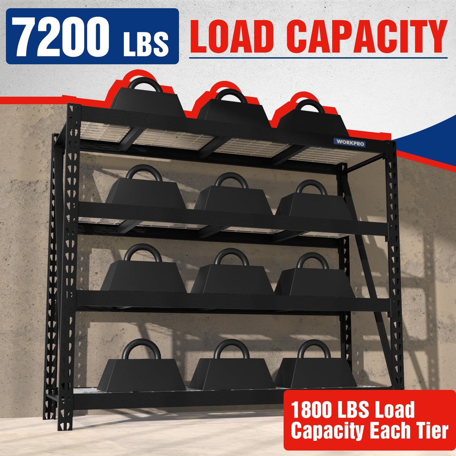 - Heavy Duty For Real - Supports up to 7200 lbs total, with each tier holding 1800 lbs. Ideal for heavy boxes, machinery, and bulk supplies in garages, warehouses, or commercial spaces.