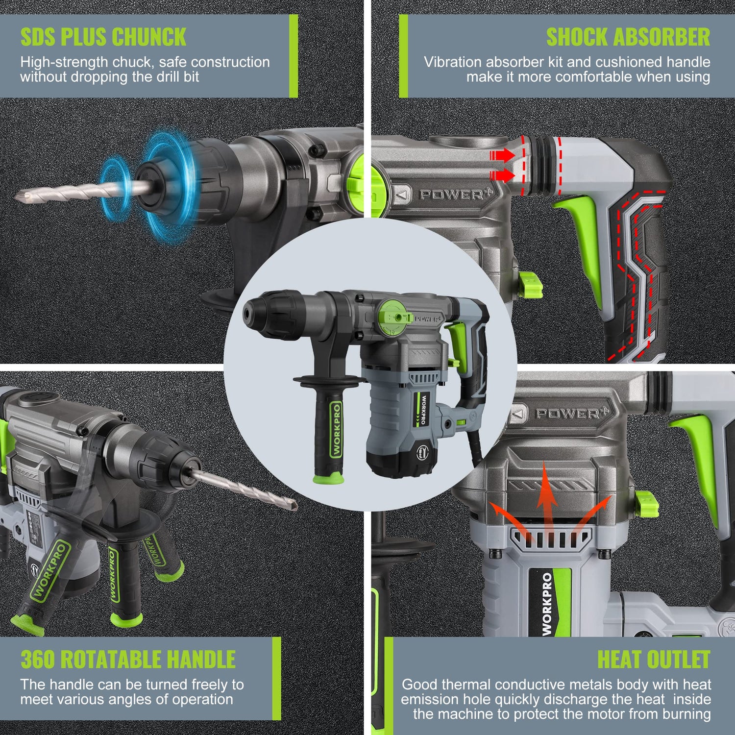 WORKPRO Premium 1-1/4 Inch SDS-Plus Rotary Hammer Drill, 12.5AMP, Heavy Duty Corded Version for Concrete Demolition Chipping Rotomartillo, 5 SDS-Plus Bits
