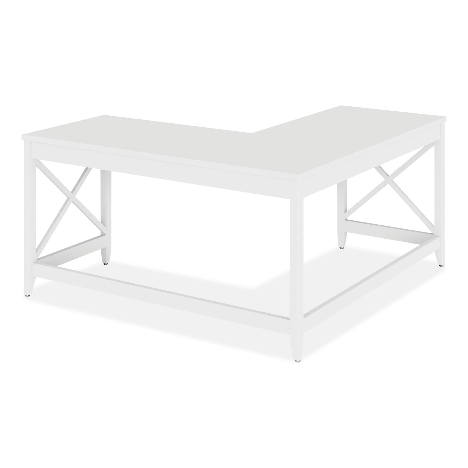 Details: Stylish, L-shaped, farmhouse desk with X accents on side panels. The multi-function desk is constructed with a smooth, laminate wood top and white wood legs. The simple design without drawers fits conveniently into a corner to maximize space. Wide tabletop surfaces provide ample space to work and display organizational or decorative items. The open design has a light, airy feel, and coordinates with most décor. Some assembly is required.