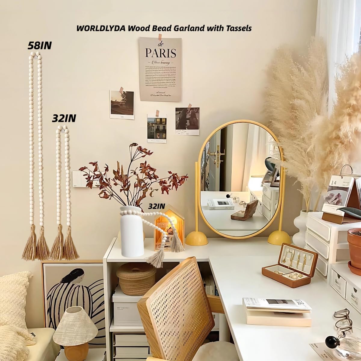 WORLDLYDA Wood Bead Garland with Tassels 58in/32in Farmhouse Wood Beads Rustic Country Decor Prayer Boho Beads Versatile Wall Hanging Home Deco (Natural 58in)