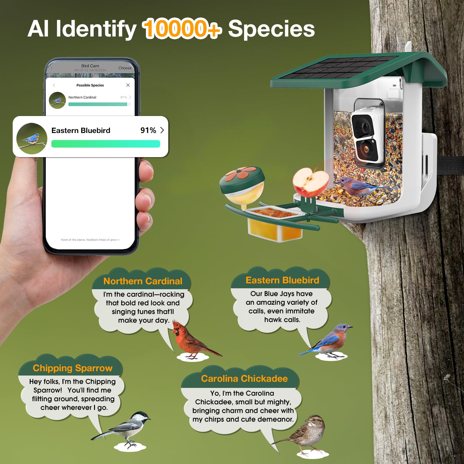 WOSPORTS Bird Feeder with Camera Solar Powered,Wireless Smart Bird Watching Camera,AI Identify 10000+ Bird Species,1080P HD Camera Auto Capture Videos,Instant Notifications,Ideal Gift for Bird Lover
