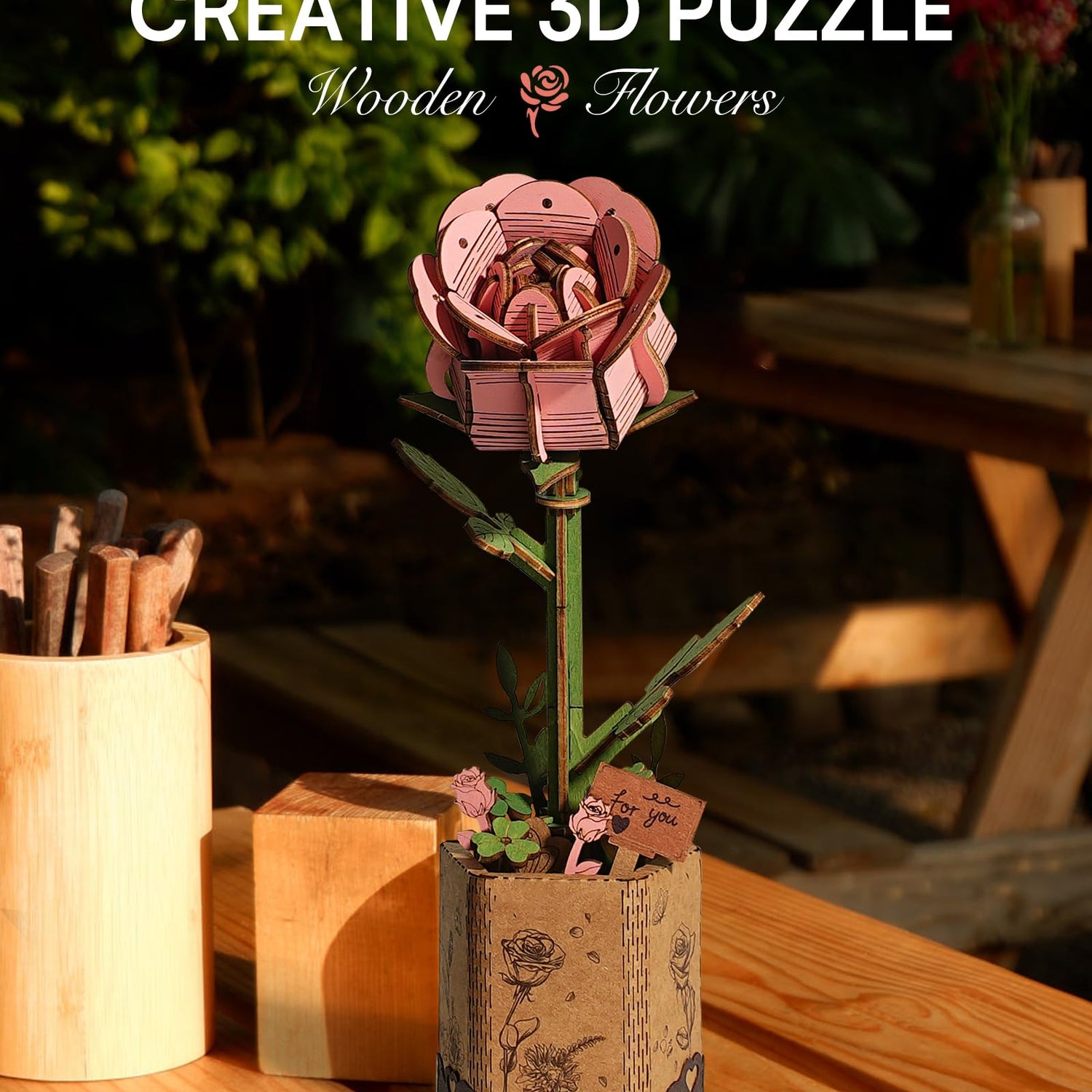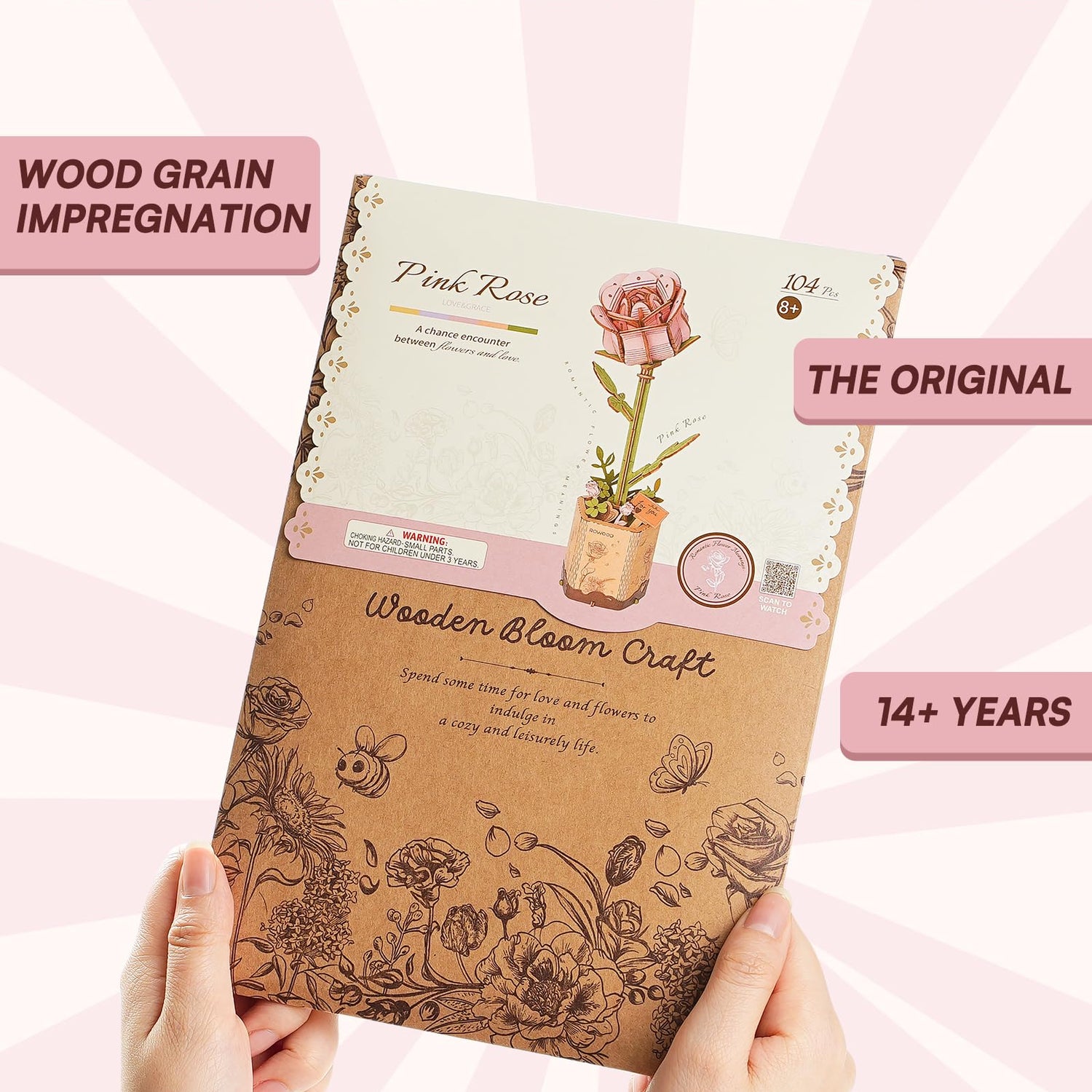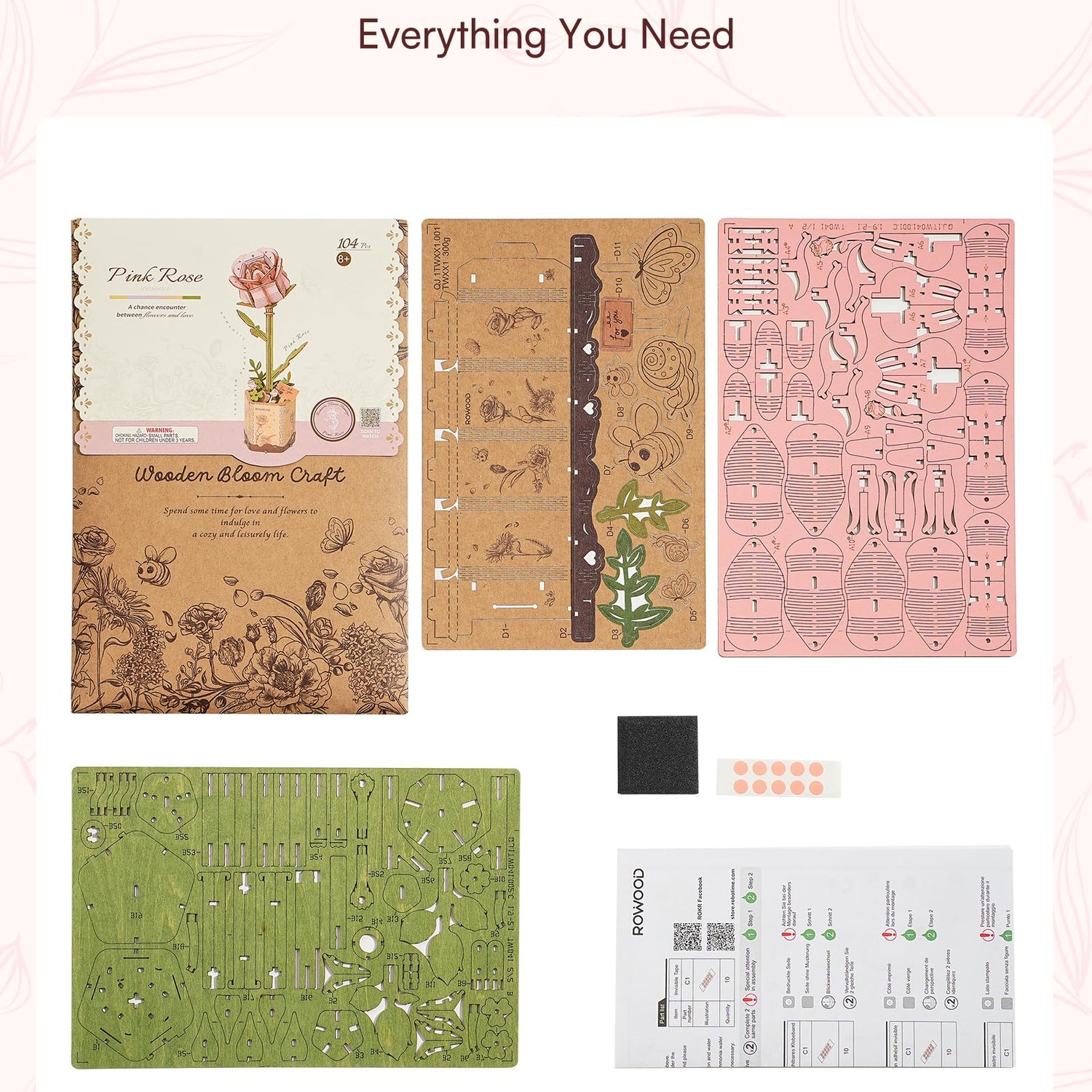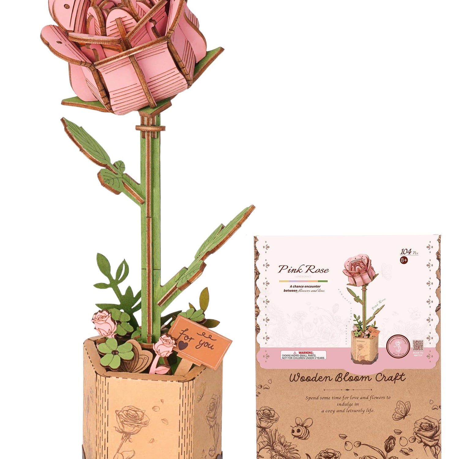 Wowood 3D Flower Wooden Puzzles for Adults-Pink Rose, DIY Wooden Flowers Model Kit Building Set Crafts for Adults to Build, Botanical Collection/Ideal Creative Gift Ideas/Housewarming (104PCS)