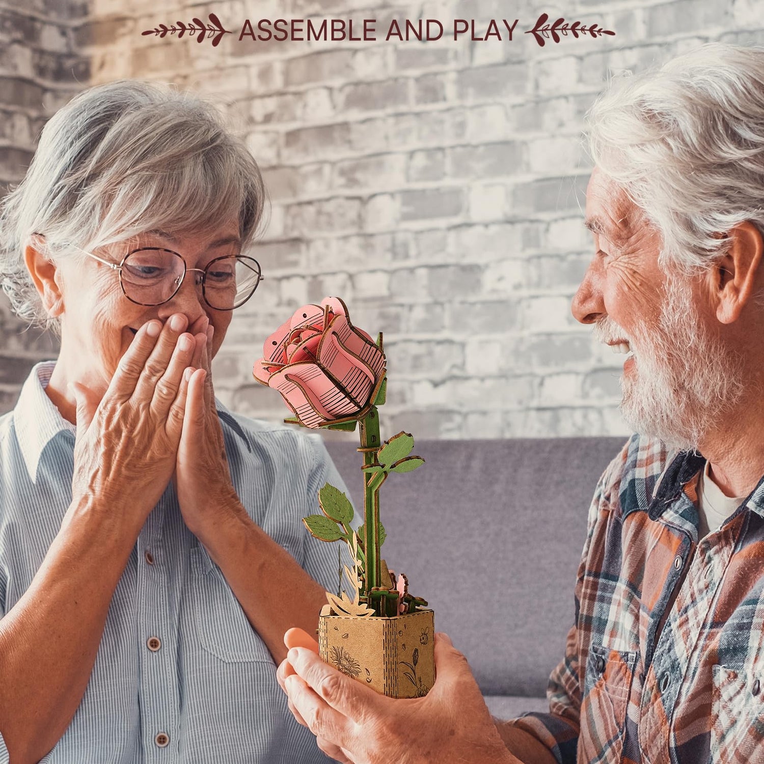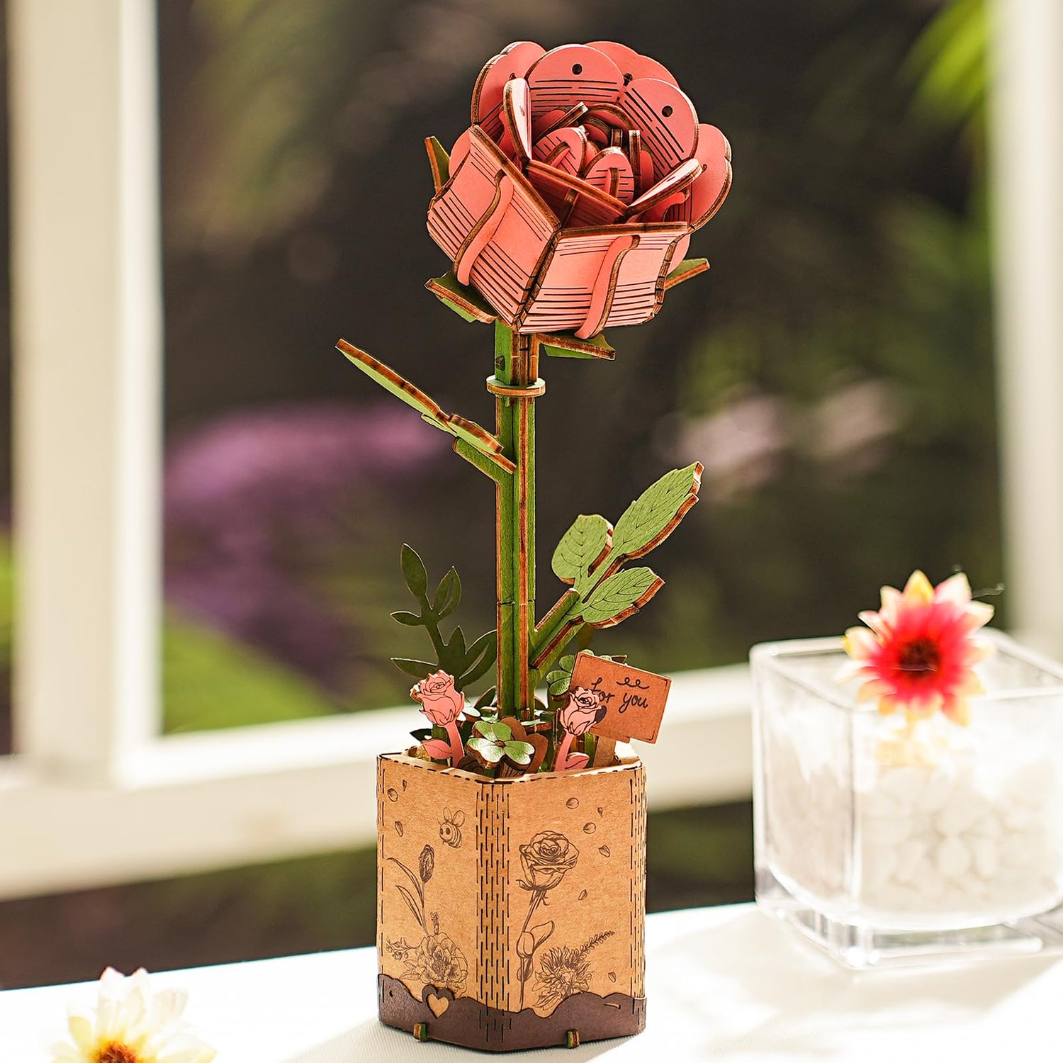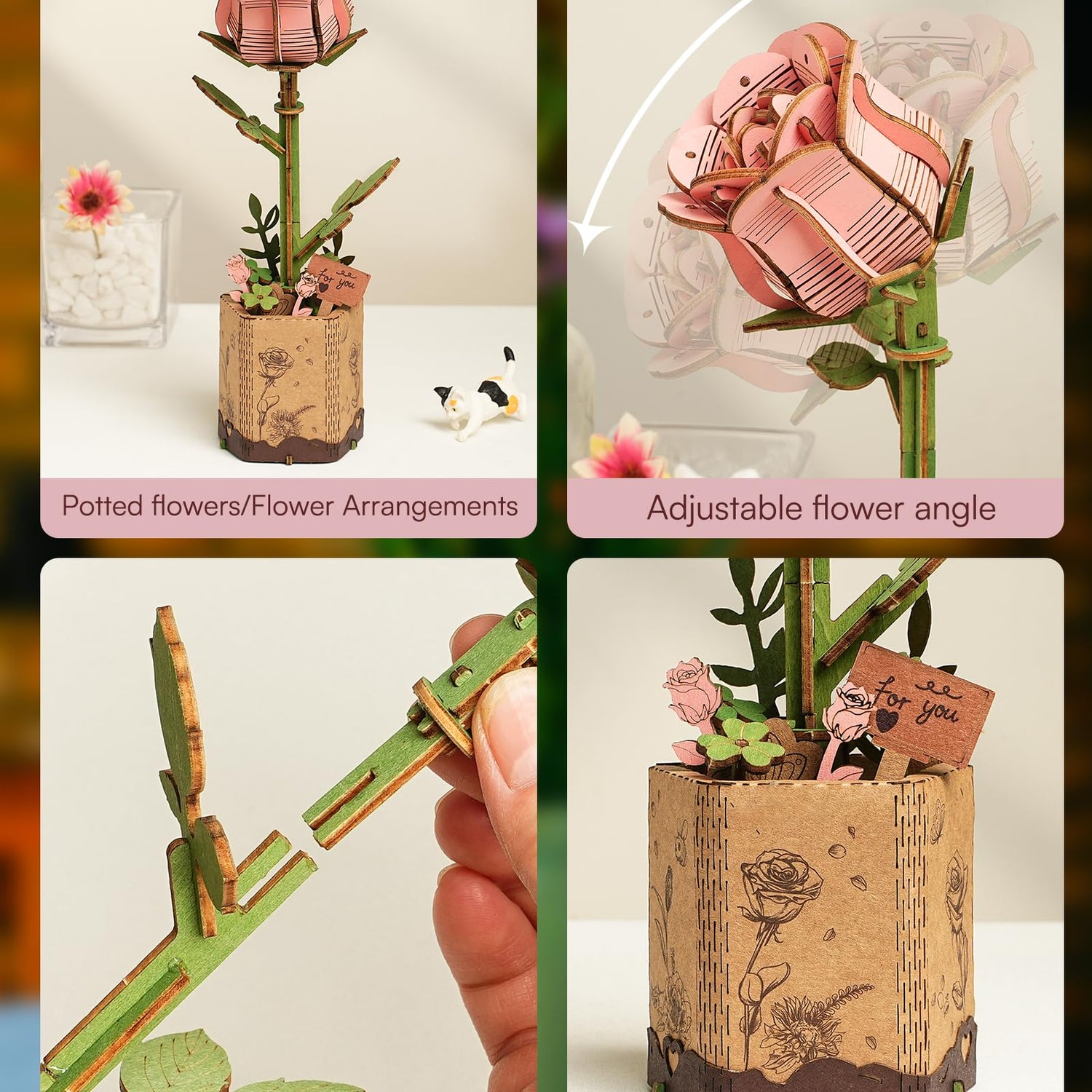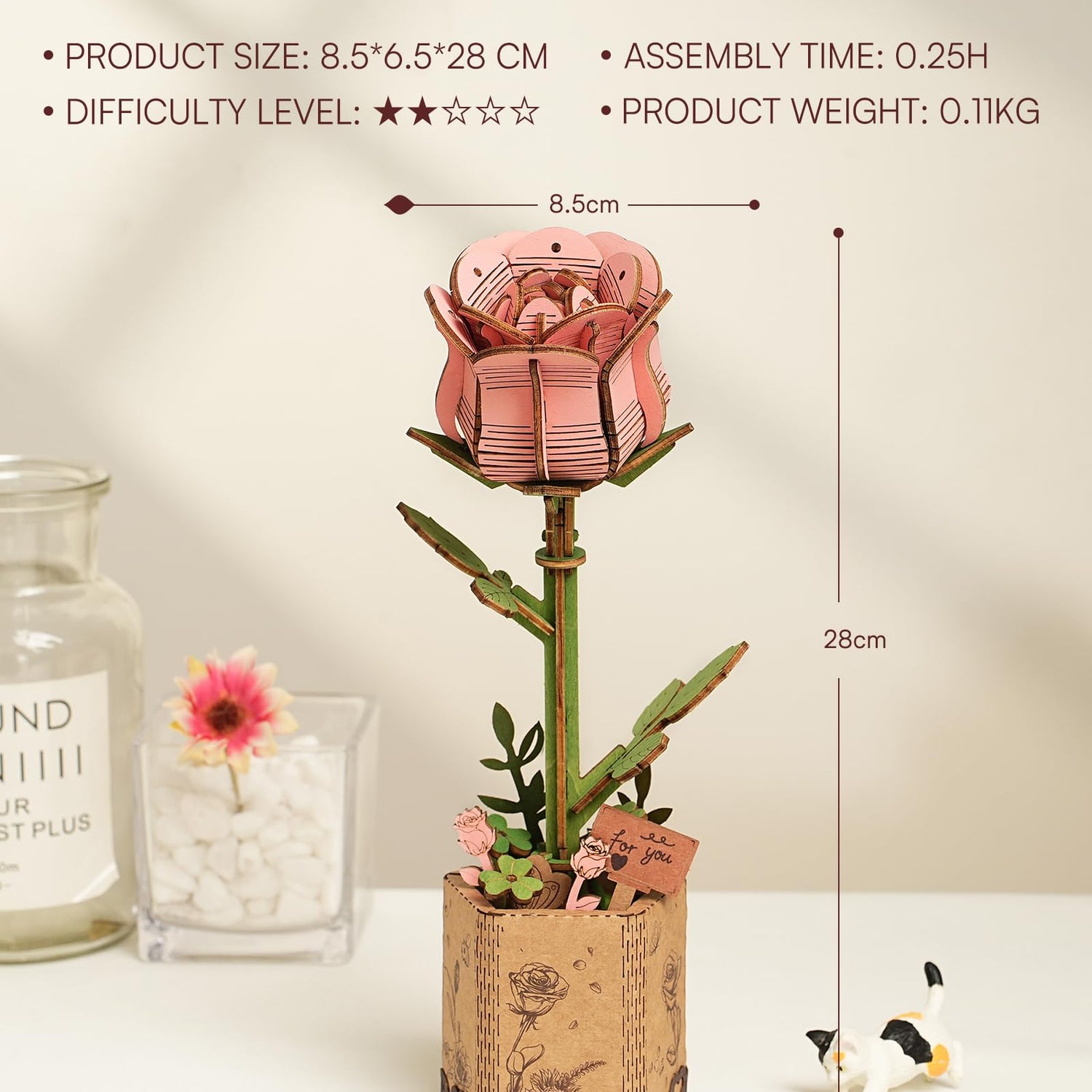 Wowood 3D Flower Wooden Puzzles for Adults-Pink Rose, DIY Wooden Flowers Model Kit Building Set Crafts for Adults to Build, Botanical Collection/Ideal Creative Gift Ideas/Housewarming (104PCS)