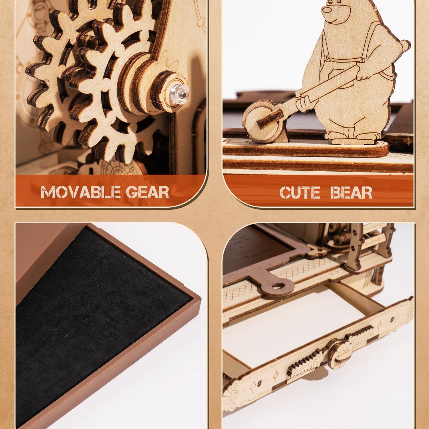 - 【Automatic Inking】The mechanical wooden puzzle is assembled with a physical structure. Just press the handle and the gear will drive the ink cartridge to flip over to print the pattern. During the printing process, there will be actions such as the bear pouring ink and pushing the printing rod, making the children feel as if they are there. A light will come on when printing is complete.