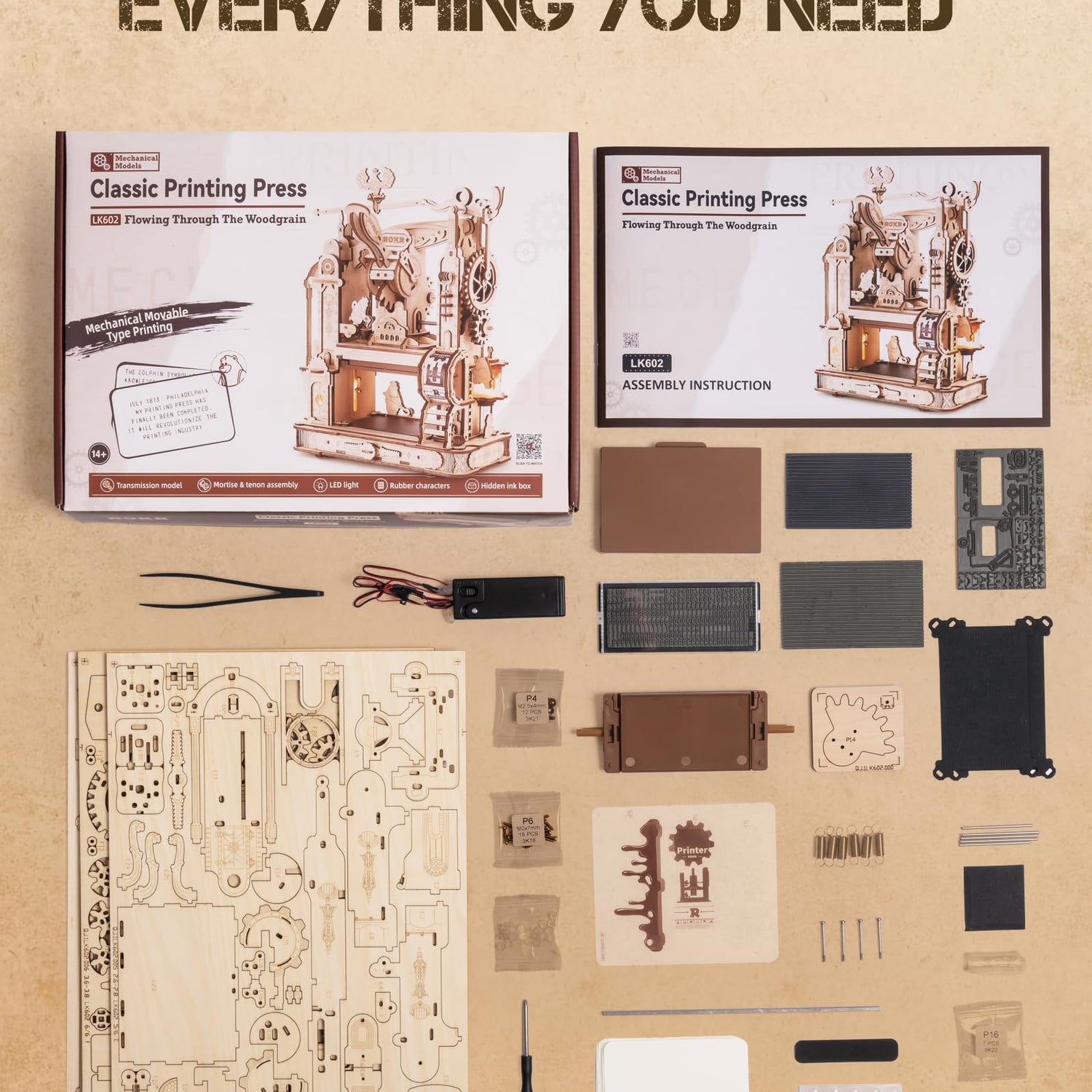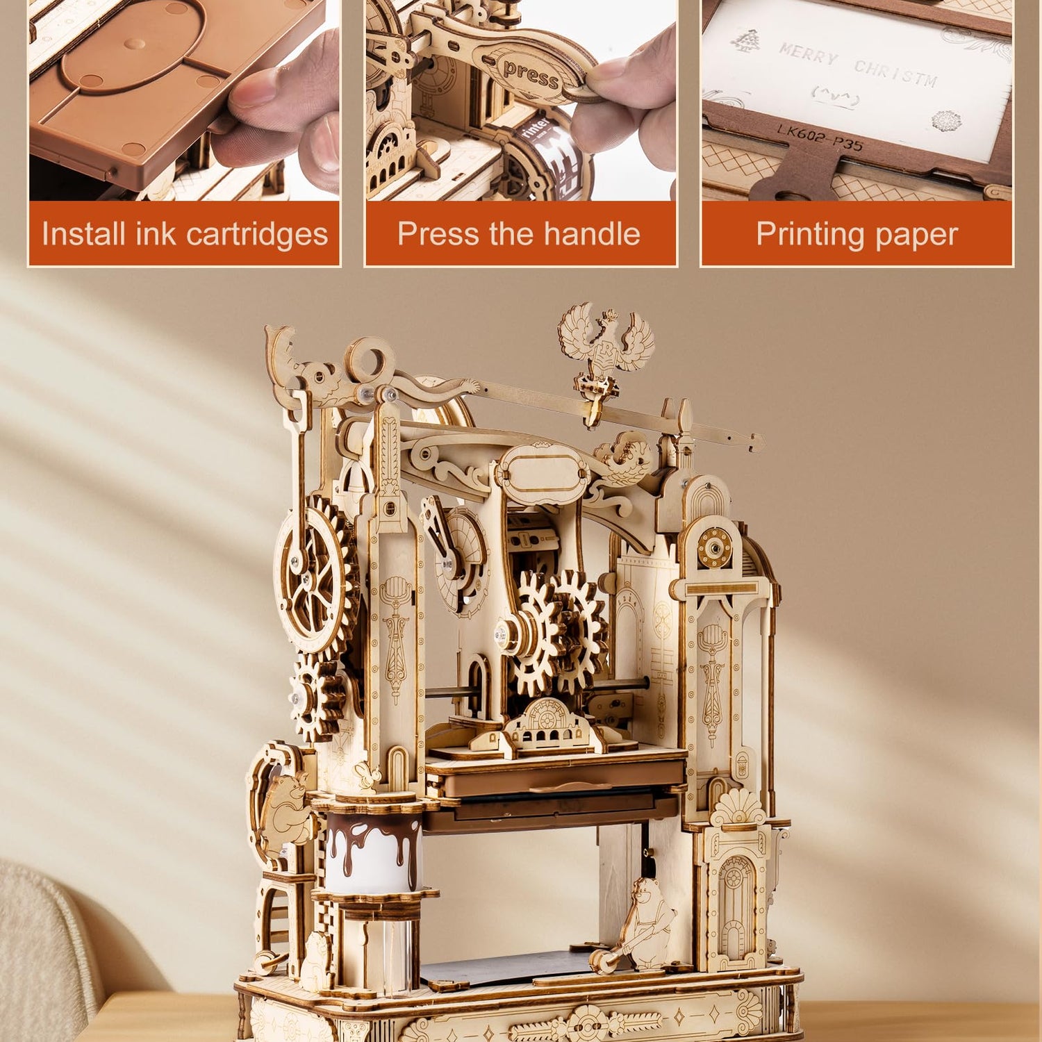 - 【Detailed Instructions】The wooden puzzle printing machine is composed of 309 pieces and measures 8.07*28.9*10.6 inches. It takes about 5 hours to assemble. The package contains all the accessories you need. Each part is labeled and you can assemble it step by step according to the instructions. If a part is damaged, you can find spare parts in the package or contact us.