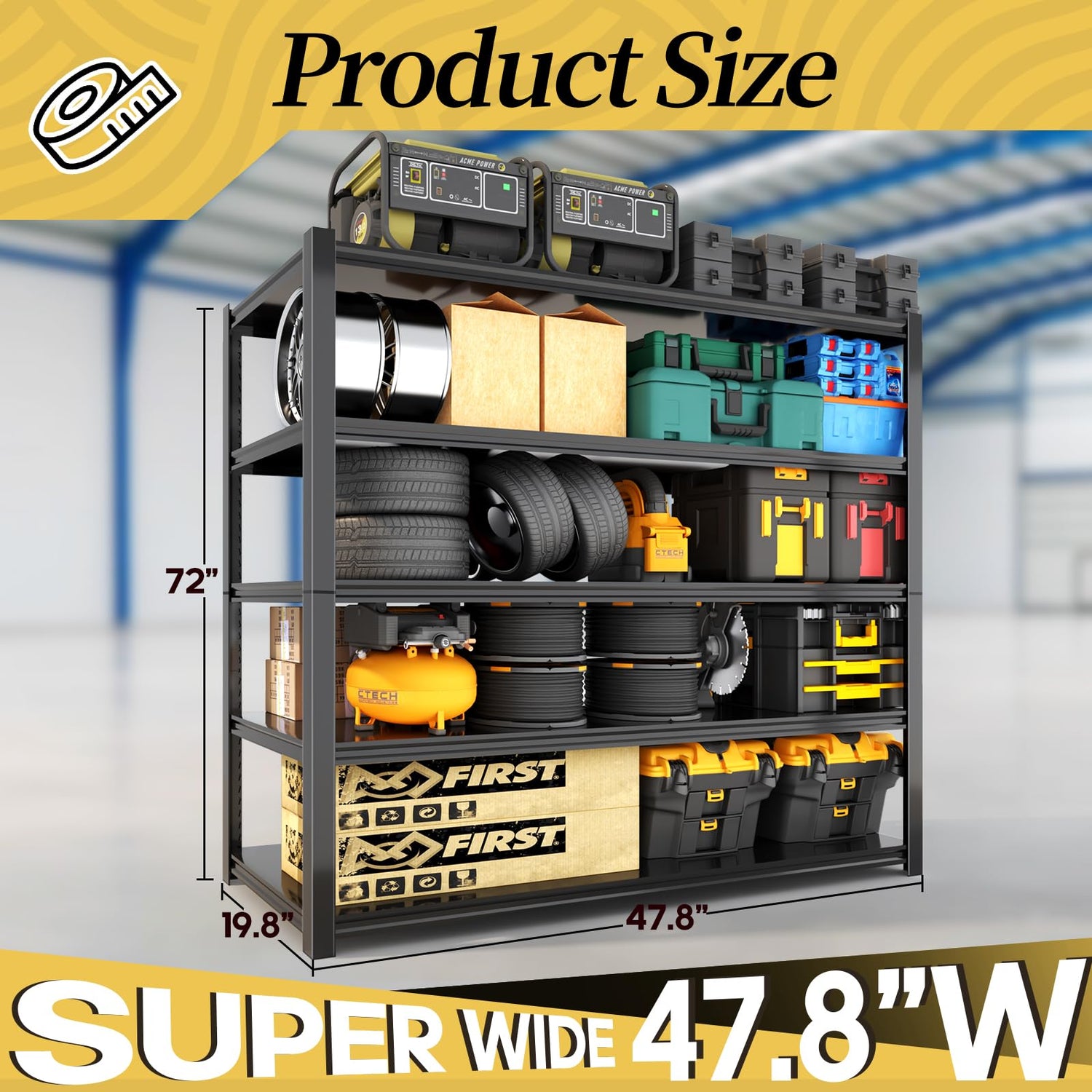 - Heavy Duty Garage Shelving Unit: This versatile shelving unit (47.8"W x 19.8"D x 72"H) is perfect for organizing tools, equipment, and supplies in garages, basements, warehouses, kitchens, or workplaces. It provides flexible storage solutions and ensures easy access to your items.