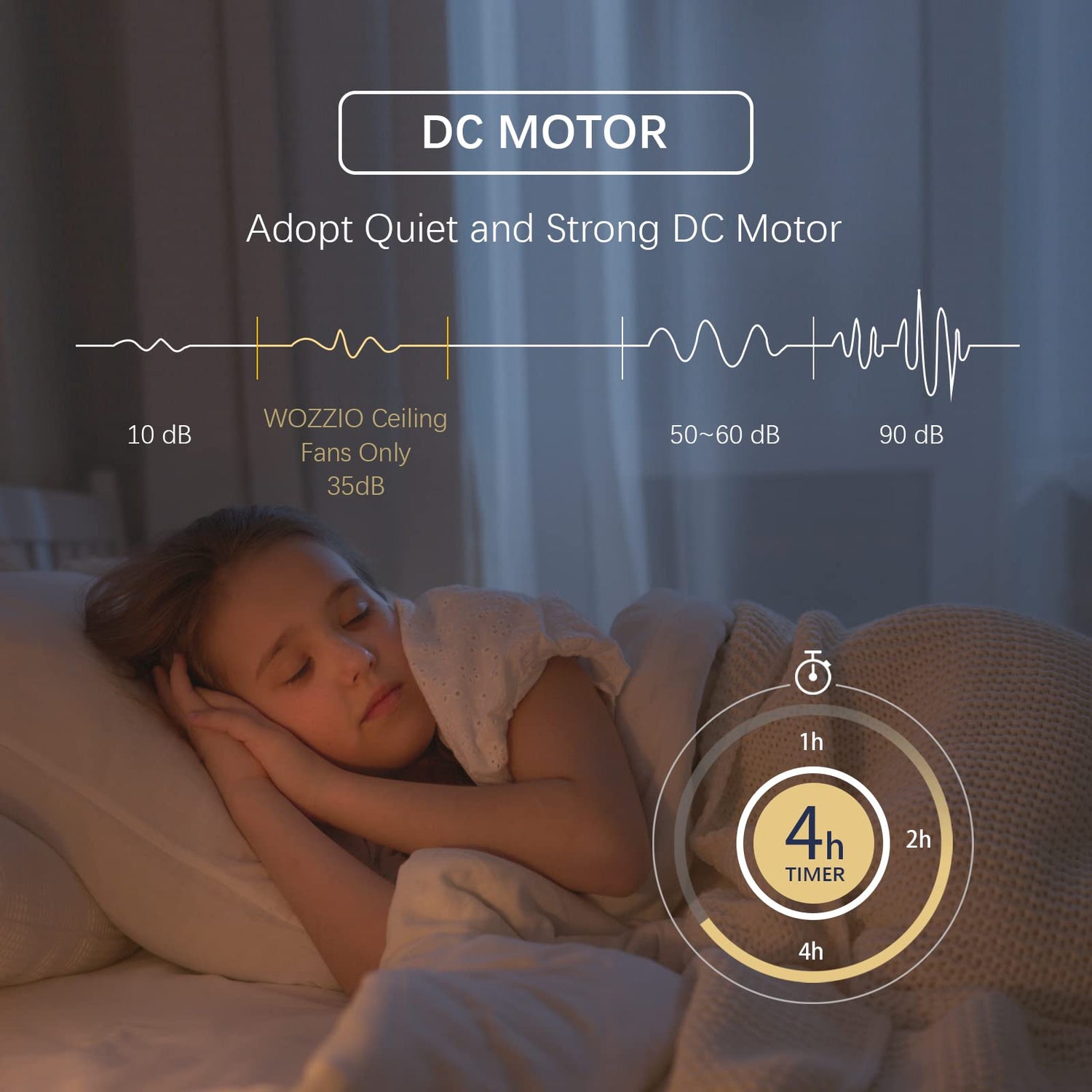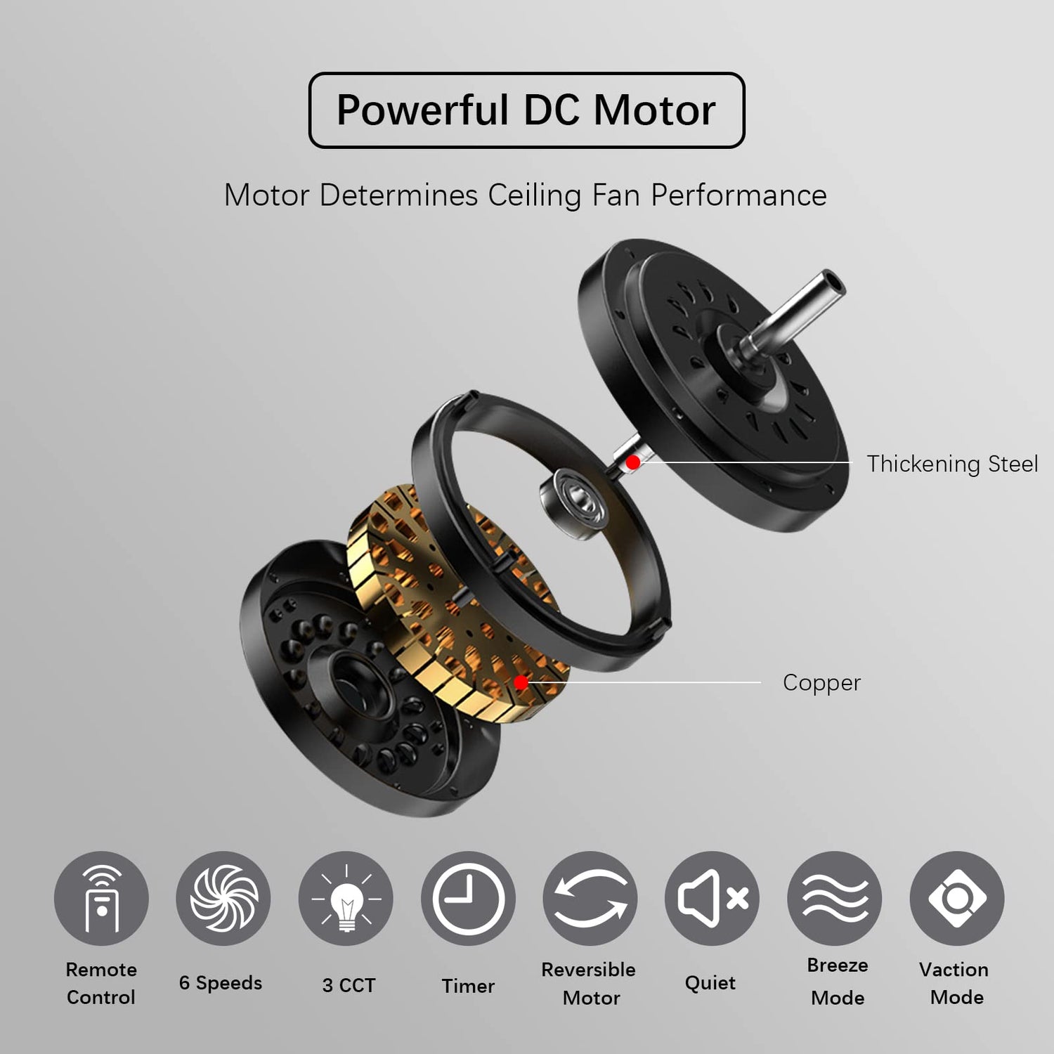 - Quiet DC Motor - ceiling fan features a noiseless DC motor that provides both durability and powerful performance, while also being energy-efficient. The 5 reversible solid wood blades of the fan can keep your room cool in the summer and assist in circulating warm air to reduce energy costs during the winter.