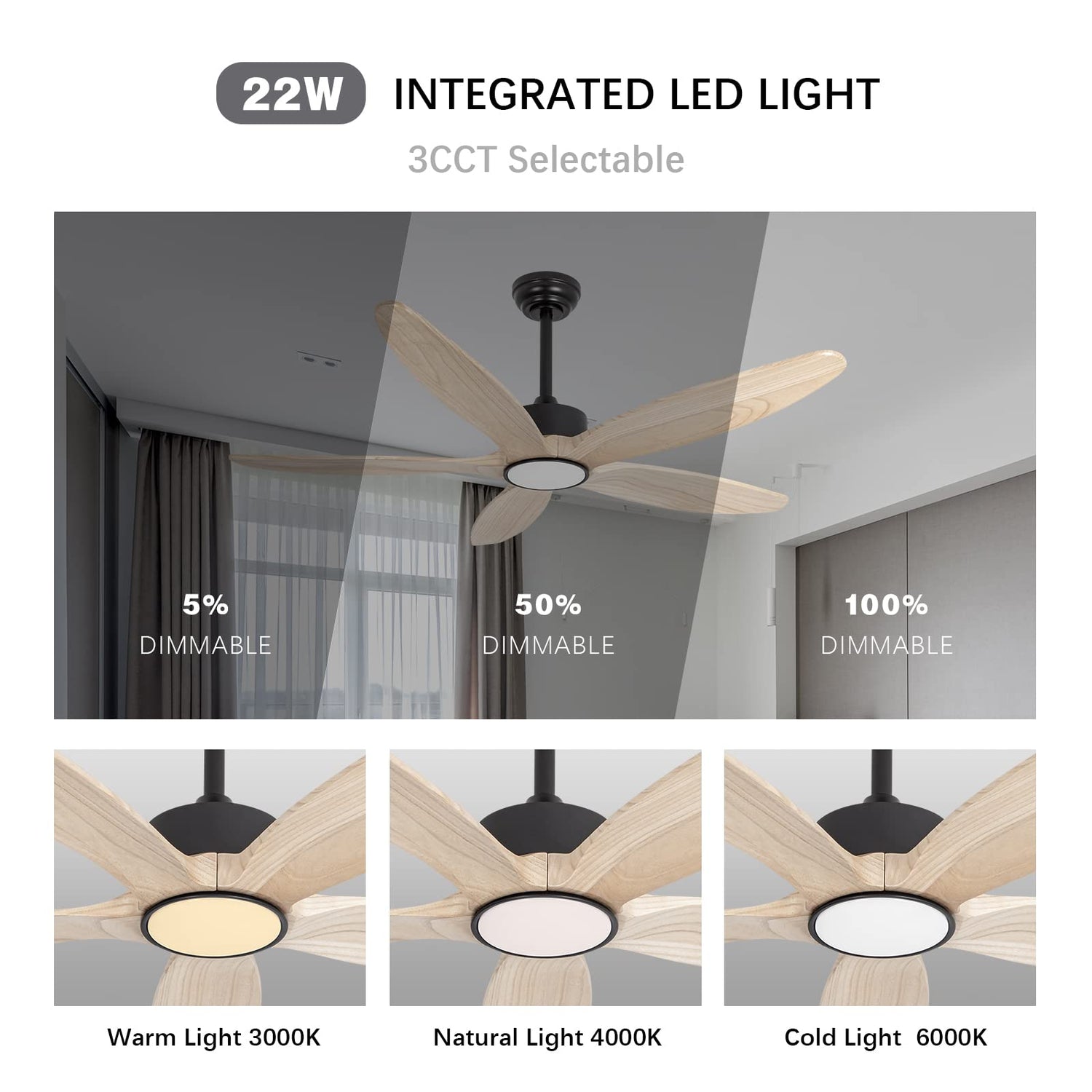 Wozzio 5 Wood Blades Ceiling Fan with Light and Remote,Quiet Reversible DC Motor,6 Wind Speed,LED Dimmable and Memory,for Bedroom/Patios/Living Room,52 inch,Natural Wood Blades