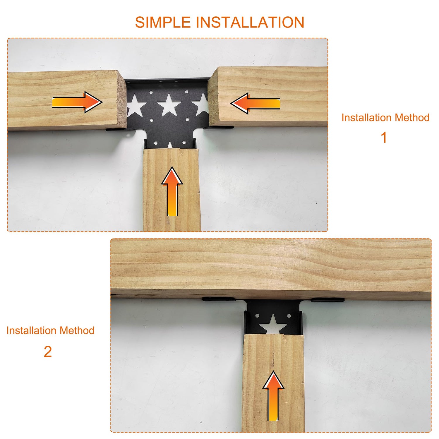 - T bracket--Each pergola bracket has φ0.25" pre-drilled holes for quick and easy installation,just cut the beam to the desired length and choose location,mark it,drill holes on the wooden beams, assembly and anchoring