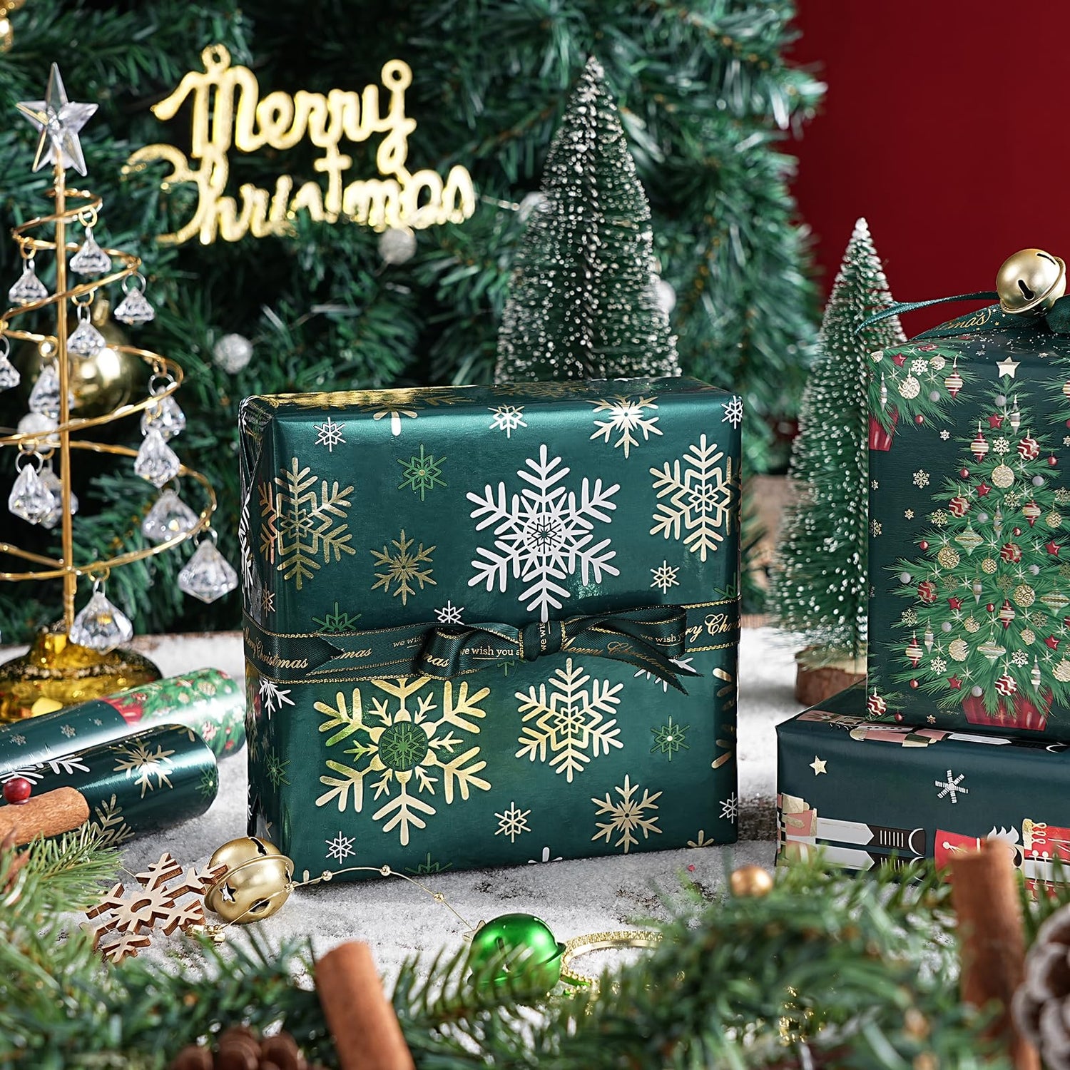 - Green Christmas Design: Includes 4 designs, Christmas nutcracker, gold and white snowflake, "Merry Christmas" lettering and Christmas tree with metallic foil shine design, all evoking the joy of the season.