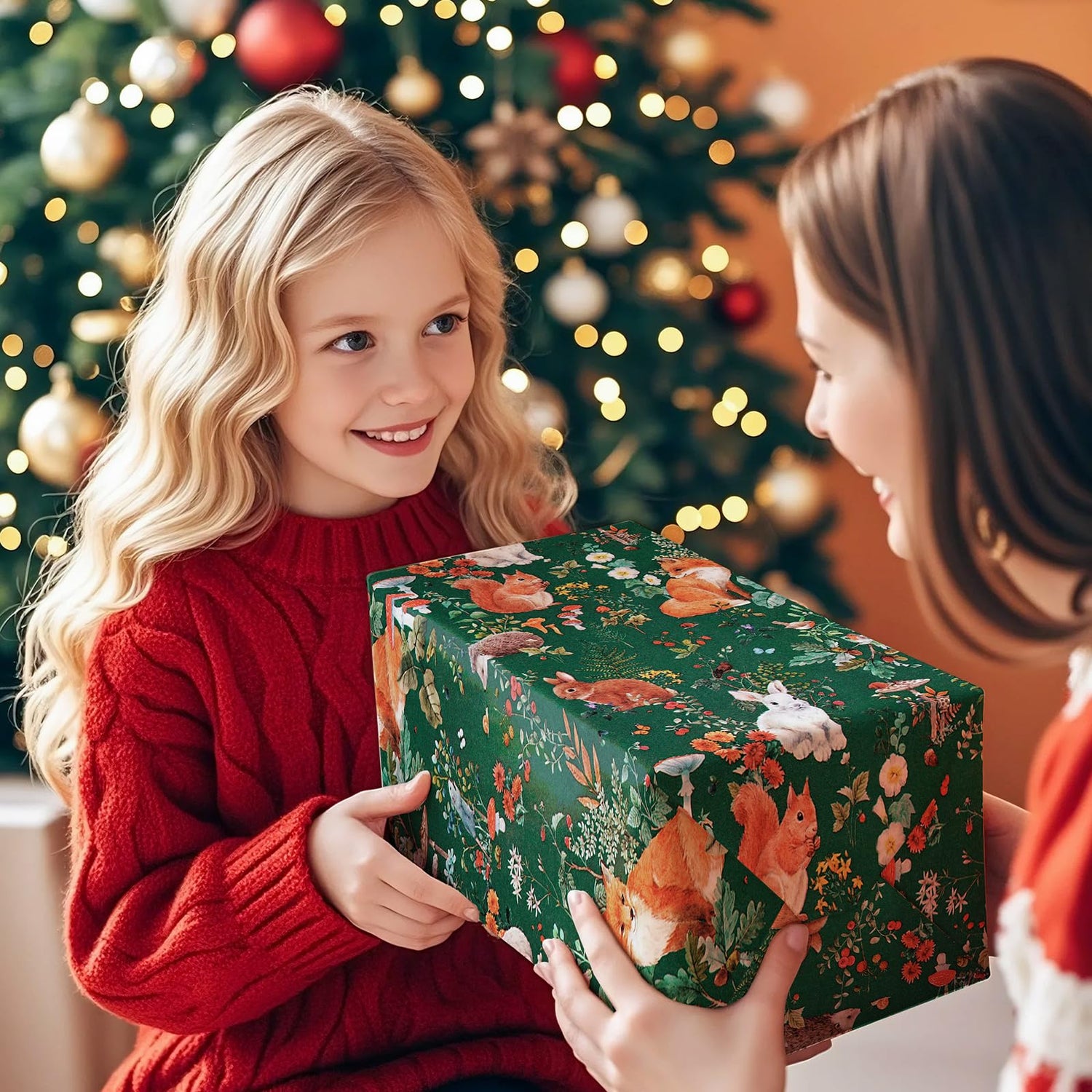 - Kraft Christmas Design: This wrapping paper features a variety of watercolor forest animals, including foxes, rabbits, squirrels, and hedgehogs, along with colorful flowers, green plants, and mushrooms, creating a magical festive atmosphere.