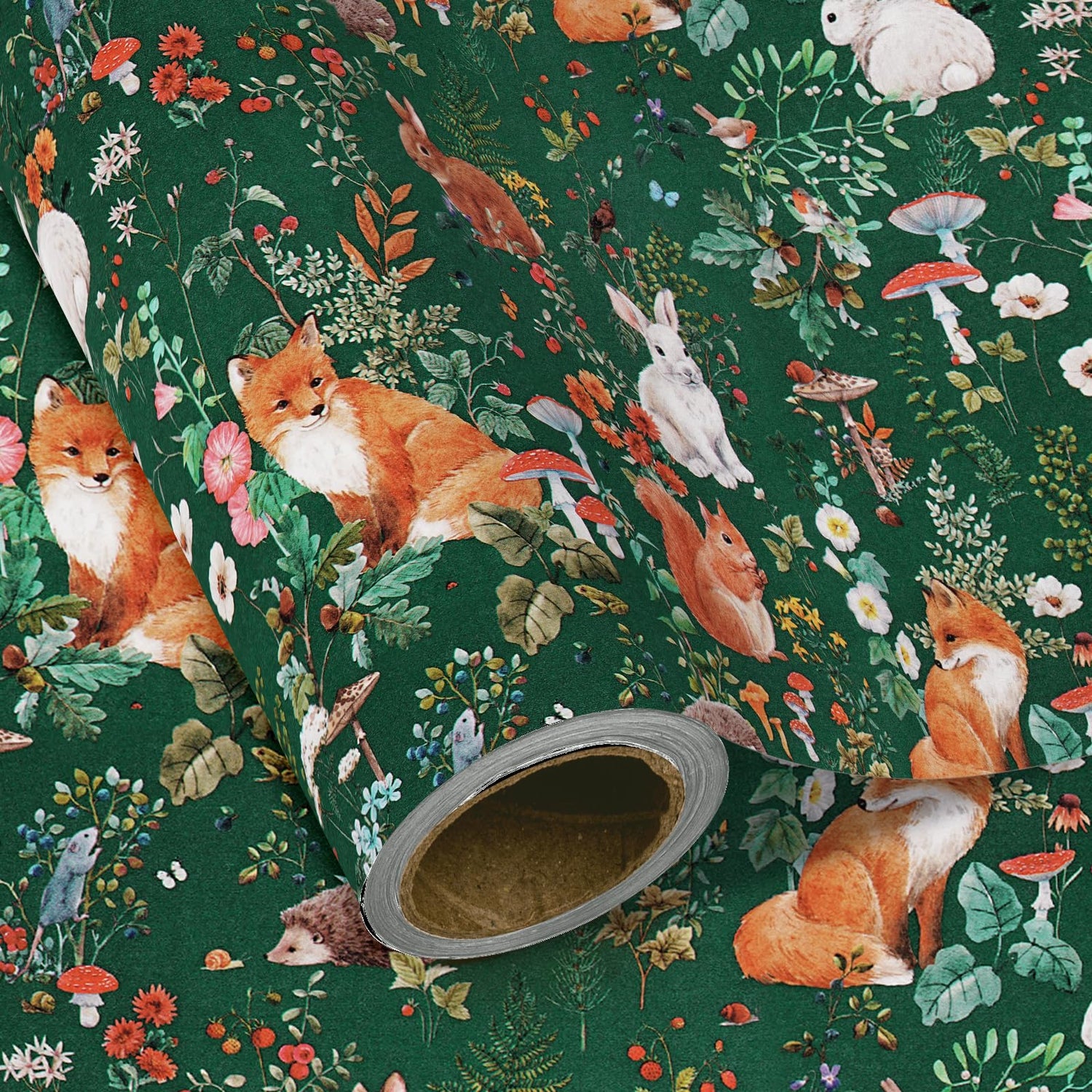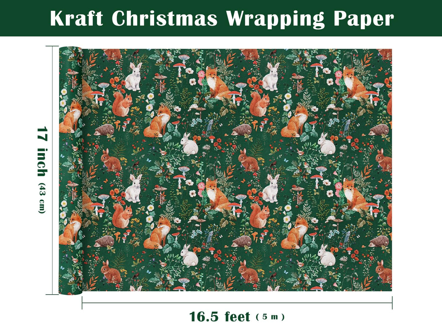 WRAPAHOLIC Kraft Forest Animal Christmas Wrapping Paper - Mini Roll - 17 Inch x 16.5 Feet - Forest Animals Fox Wrapping Paper with Flowers Design for Christmas Holiday, Party Celebration