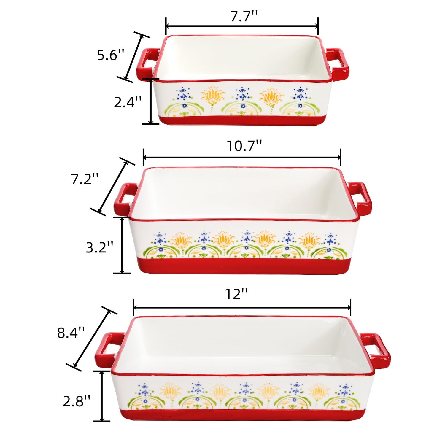 - 3 Sizes for All Needs: Comes with 3 sizes (excludes the ears' size), large: 12"x8.4"x2.8", suitable for casseroles, lasagne; Medium: 10.7"x7.2"x3.2", ideal for grilling meat, baking bread or cake; Small: 7.7"x5.6"x2.4", perfect for salad, mashed potatoes