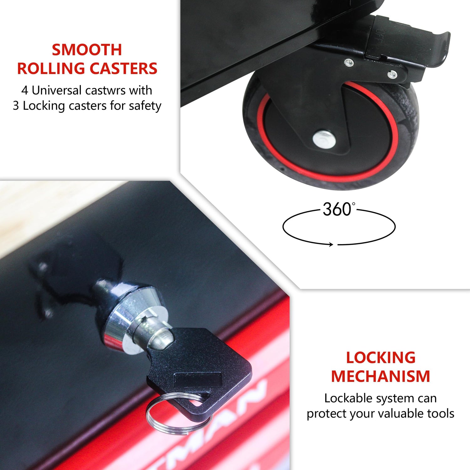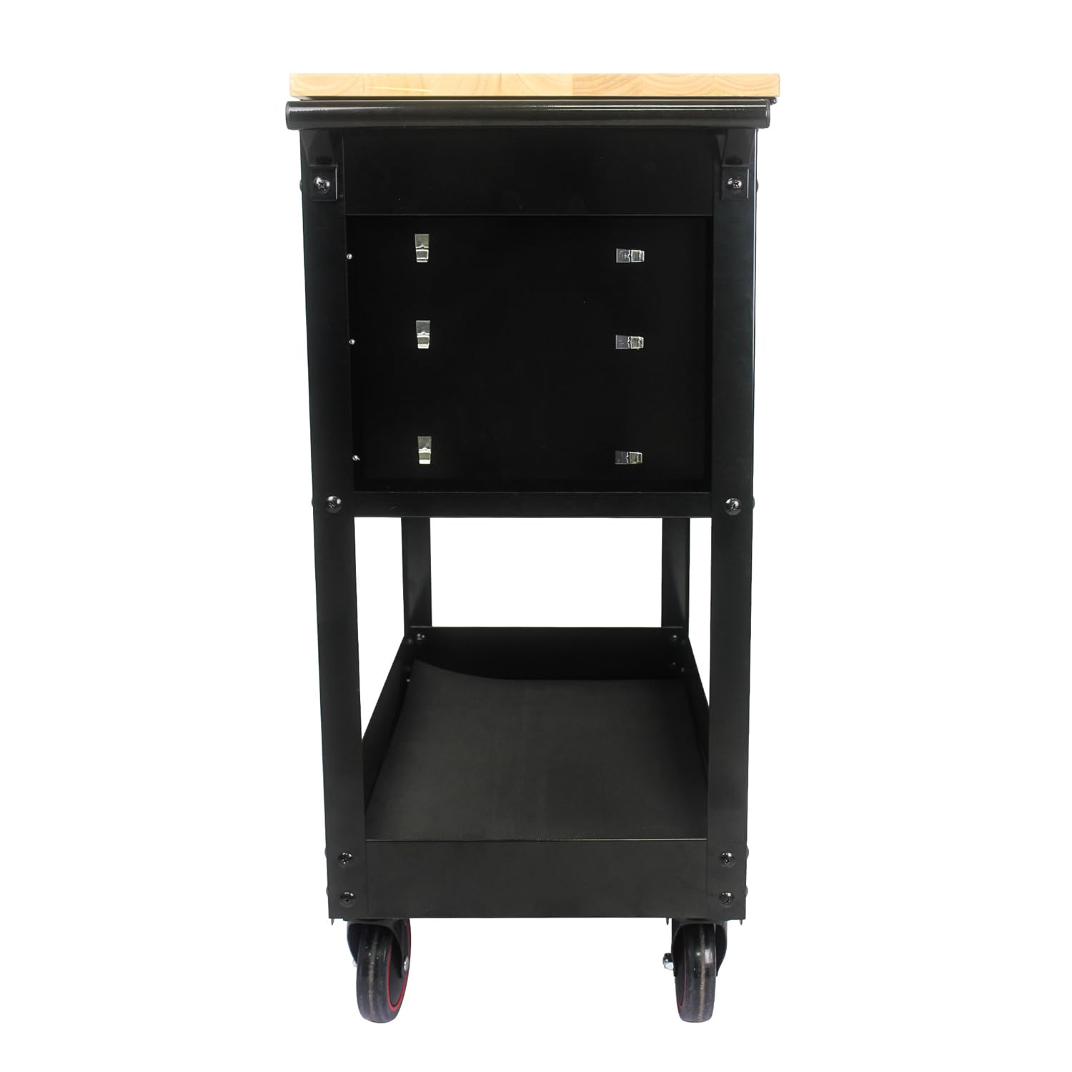 - [Larger Capacity] - Different from other fixed tabletops, there is extra storage space under the 27-inch wood top, which can be opened for storage. With 3 drawers and a large storage space on bottom, the utility tool cart provides ample storage for all your tools. Equipped with an interlock system, only one drawer can be opened at a time to keep your items protected.