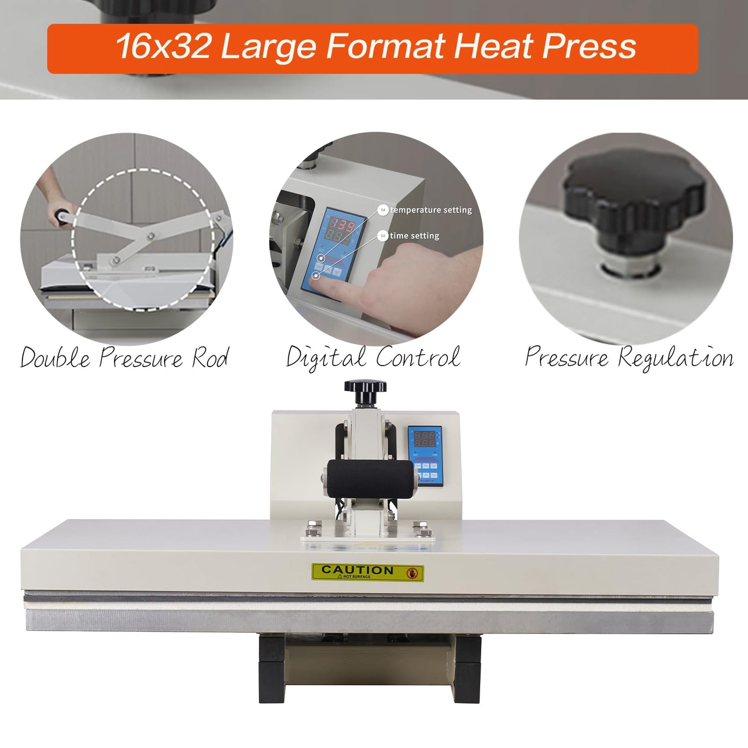 - Large Format Heat Press Machine: The Platen size is 16x32 inch, provides a spacious working area, perfect for large heat transfer projects such as T-shirts, big mouse pads, and license plates.