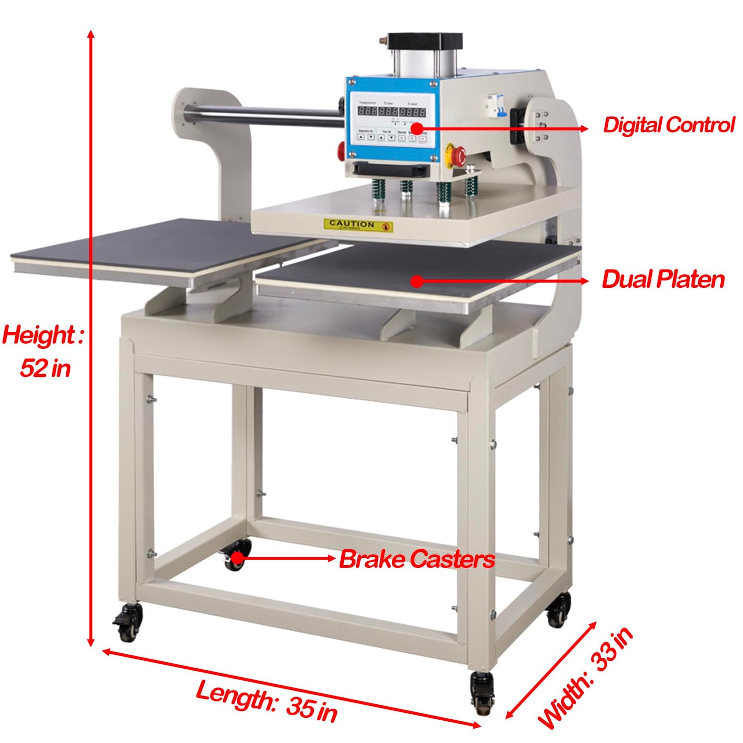 - Portability Stand: Heat press machine with base frame for much stable printing and easy movement with the brake caster, Pneumatic heat press transfer machine makes machine more convenient for printing;T-shirt printing machine is more accurate for small items printing;Heat press machine powered by an air compressor ( not included).