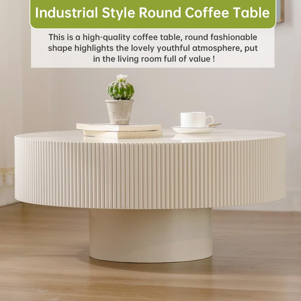 WUPDPQS Round Drum Coffee Table White Round Fluted Coffee Table Wood Circle Coffee Table Circular Pedestal Coffee Table Industrial Center Table for Farmhouse Living Room (White, 30.9 * 30.9 * 13.8")