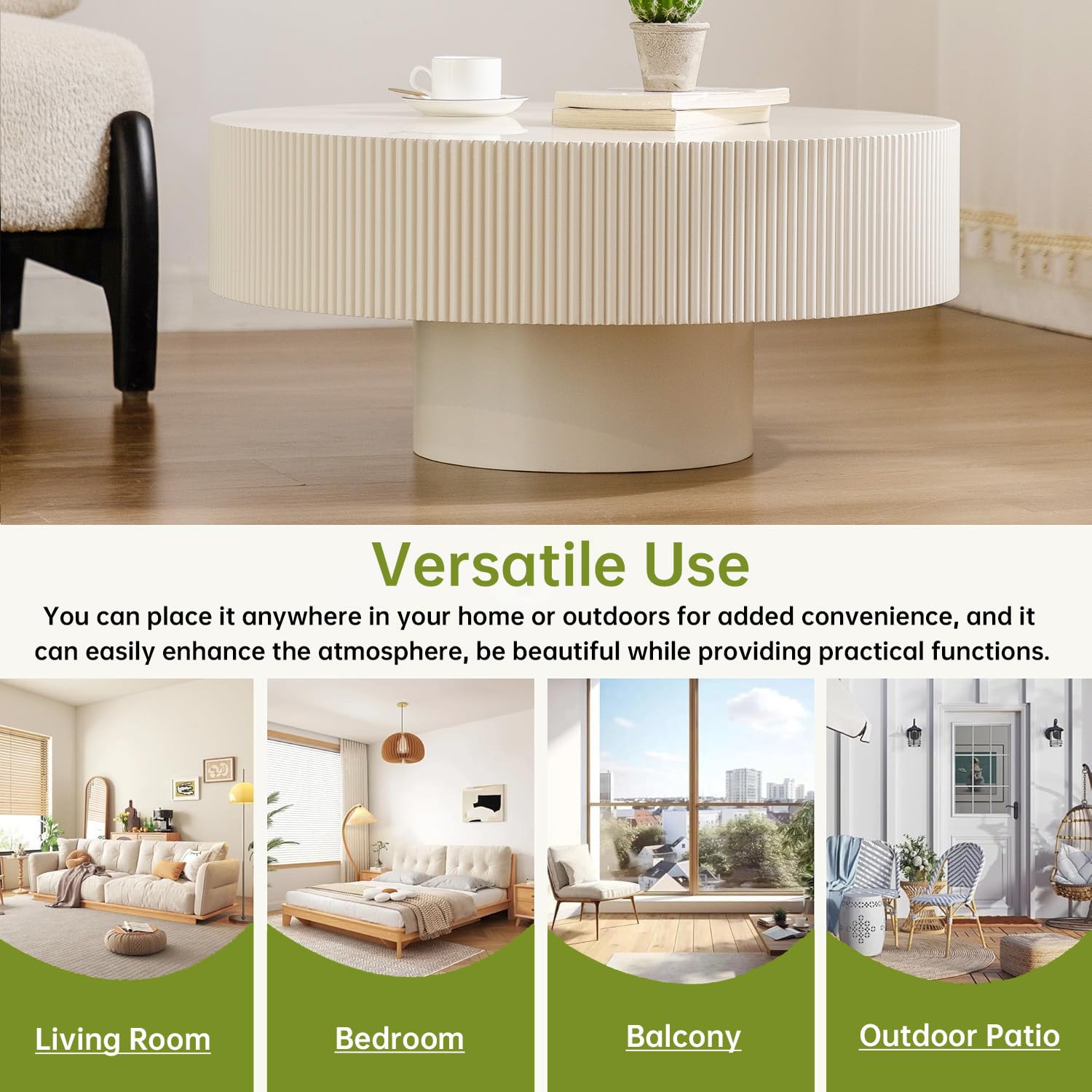 - Suitable Styles: The design of the rustic round coffee table seamlessly fits multiple home decor styles, including modern minimalist, Scandinavian, and luxury, making this round fluted coffee table a versatile and stylish addition to any interior. Picture sunlight streaming through the windows and casting gentle shadows on this round pedestal coffee table, enveloping the room in a tranquil and harmonious atmosphere.