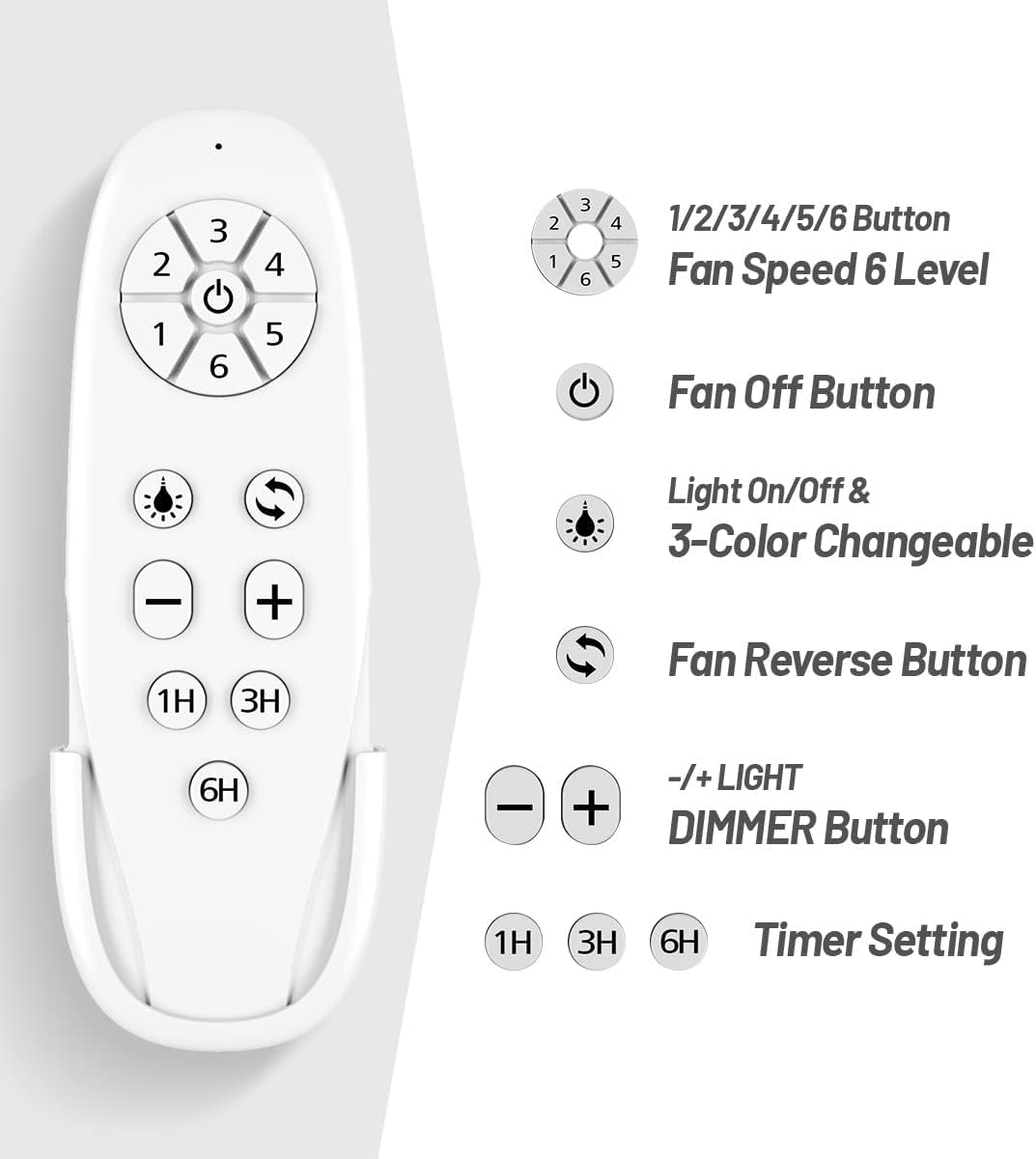 - 6-Speed Ceiling Fan: Controlling the ceiling fan light has never been easier. Outdoor ceiling fans with a remote control can control six speeds of wind, you can easily control the fan's wind speed while lying on the sofa. When you go to bed at night you can time the fan with the ceiling fan remote control, you don't need to get up to turn off the fan.
