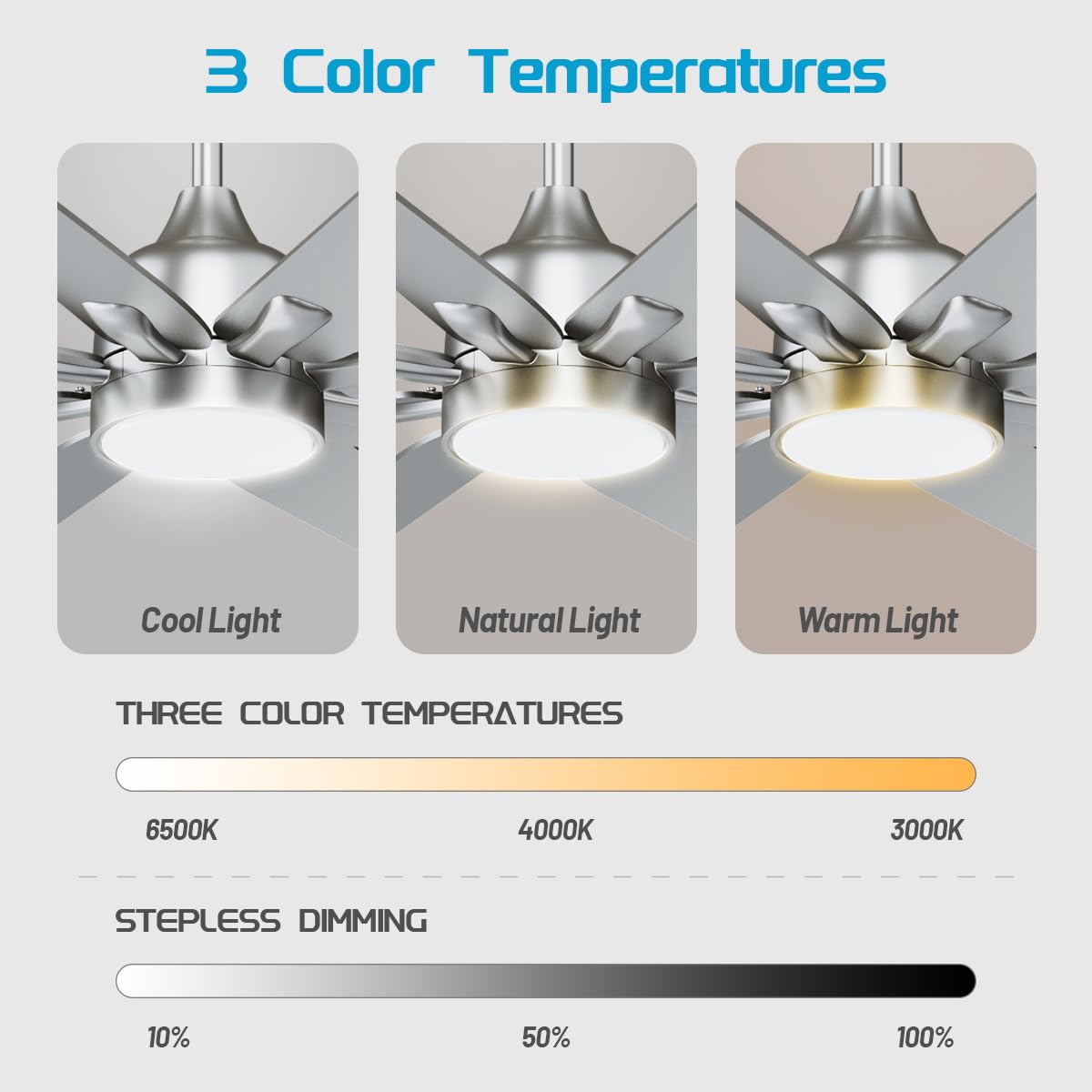 - Dimmable LED: Large Ceiling fans use a 24W LED light source. There are 3 color temperatures to choose from (3000K warm yellow light / 4000K natural light / 6500K cool white light) with adjustable brightness (20%-100%). You can use different color temperature and brightness when you are partying, working or reading.