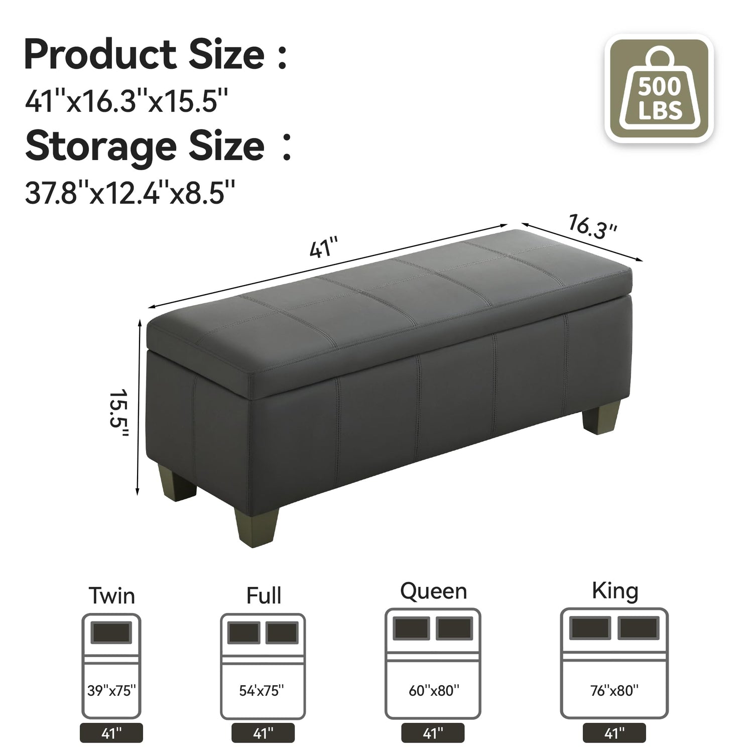 WUTUTUEE 41" Faux Leather Storage Ottoman, Stitch Tufted Rectangle Upholstered End of Bed Storage Bench, Entryway Large Couch Ottoman with Wooden Legs,Dark Grey