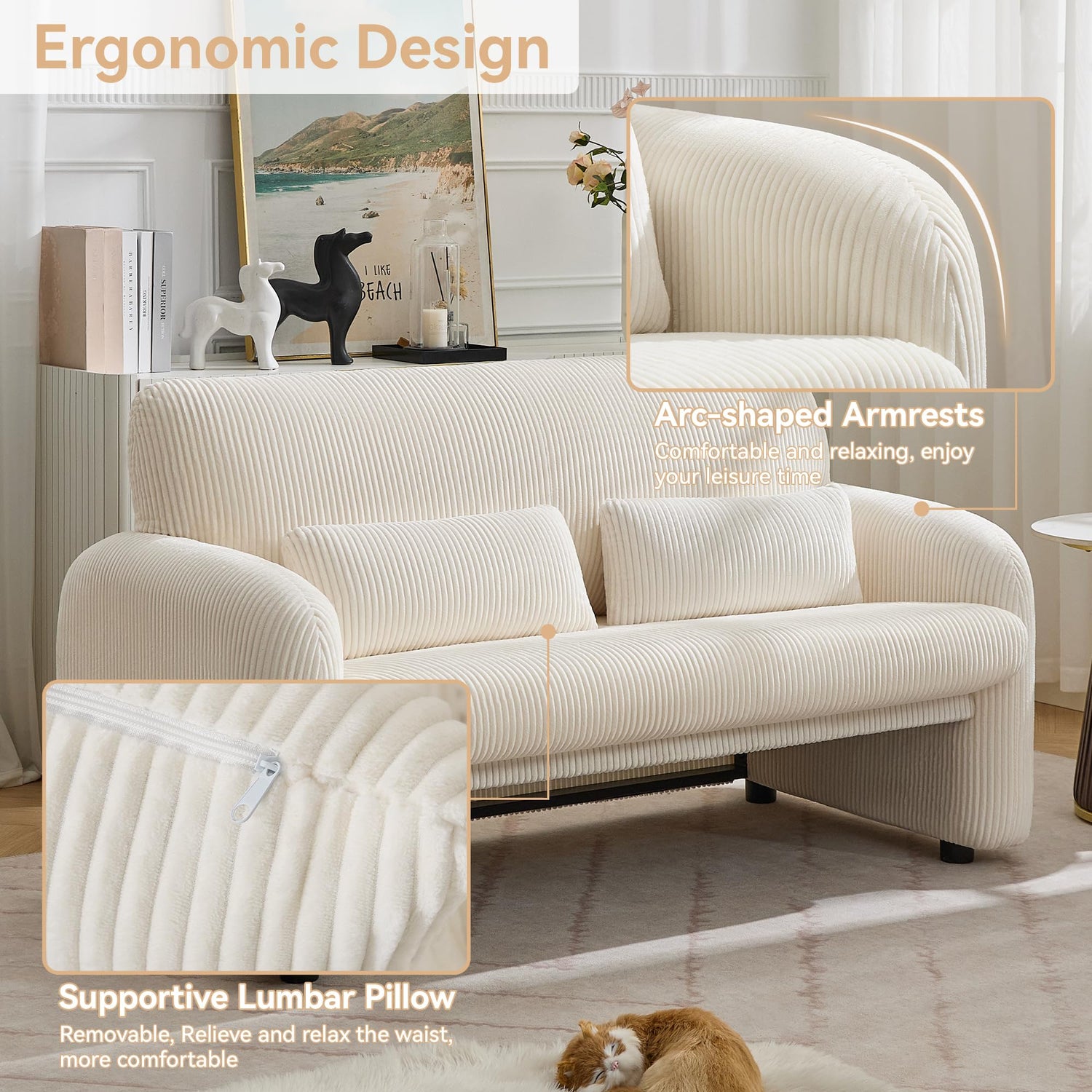 - Soft Corduroy Fabric: This stylish loveseat features soft corduroy fabric that’s gentle on the skin and breathable for year-round use. The vertical ribbed texture adds modern charm, perfect for upgrading your living room or apartment.