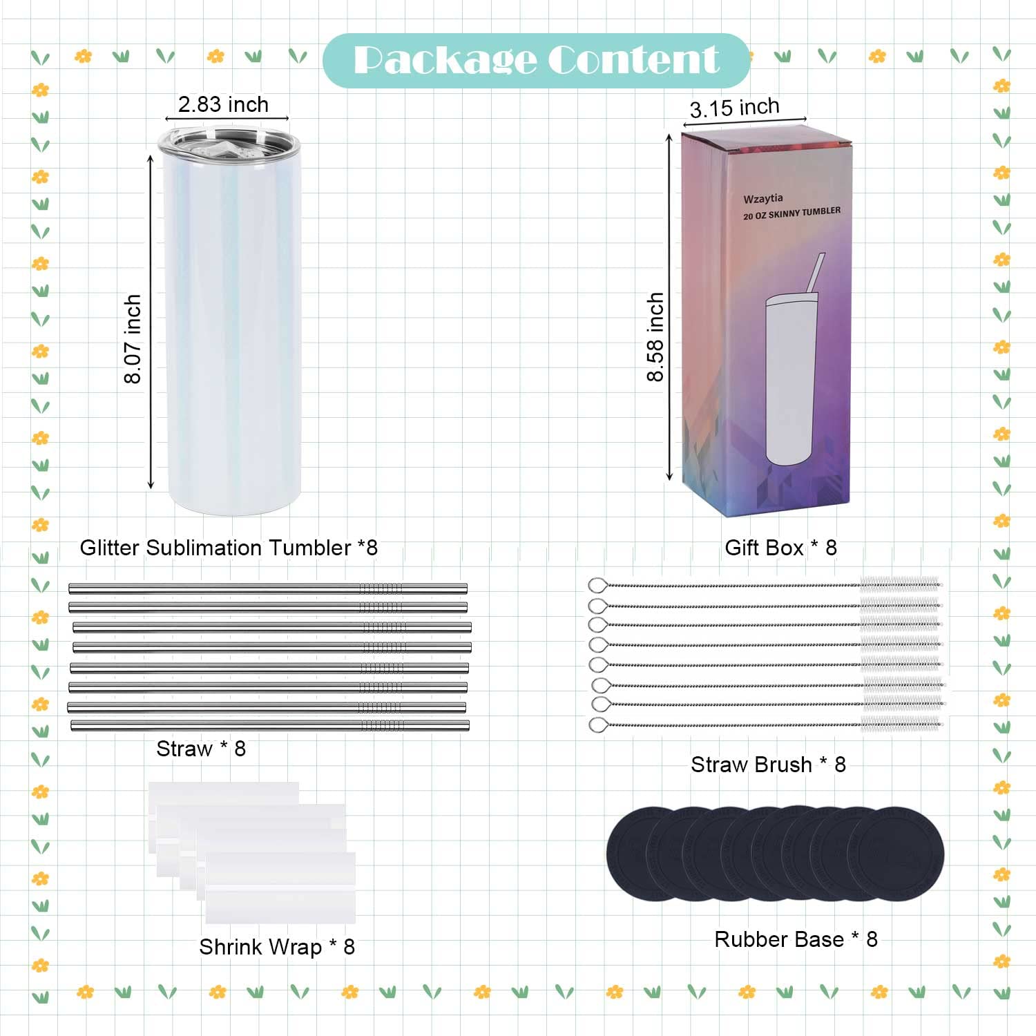 - INDIVIDUALLY GIFT BOXED: The 20 oz glitter sublimation blanks tumblers are individually gift boxed, and gift-ready.You don't need to repack them when sending as a gift. Also, shrink wrap, rubber base, straws and straw brush are included.
