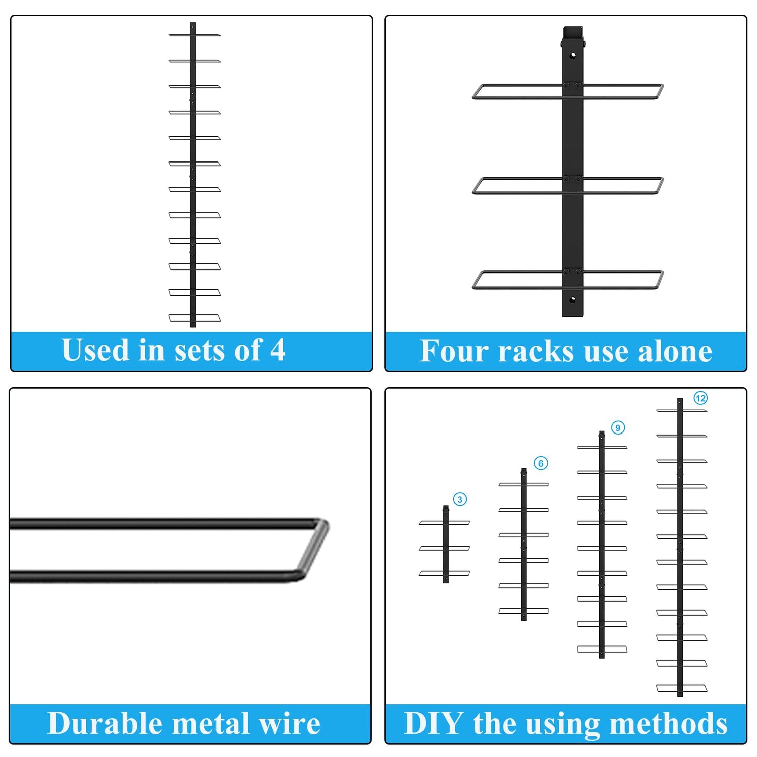 - 2 Ways-Used As 1 or 4: Our 12 bottle detachable wine rack has two ways to store bottles. One way, work a long horizontal wine rack: Connect 4 small brackets together. In this way the wine rack could store up to 12 bottles. Second way, install 4 racks, each rack could hold 3 bottles. You can hang 2 or 3 or 4 racks on the wall, DIY the using methods.