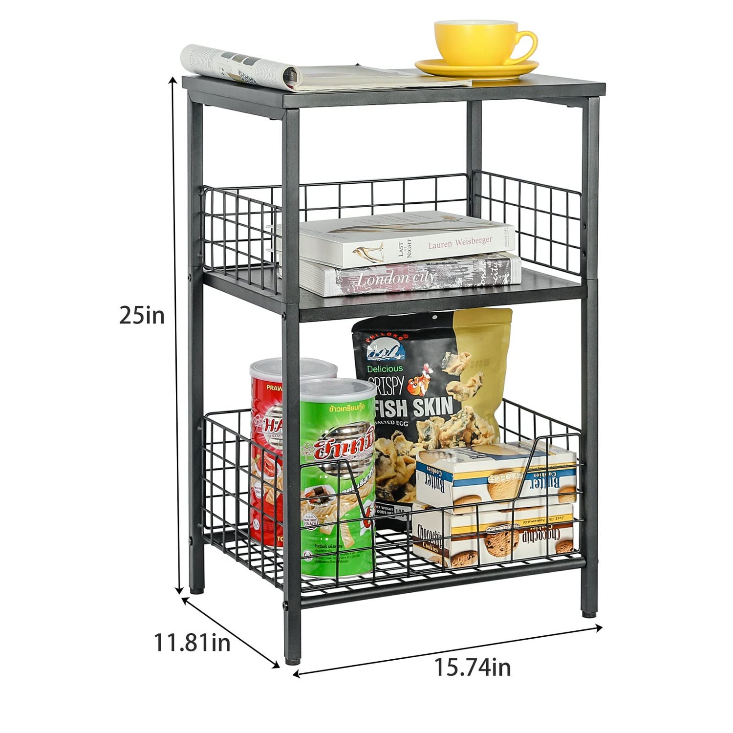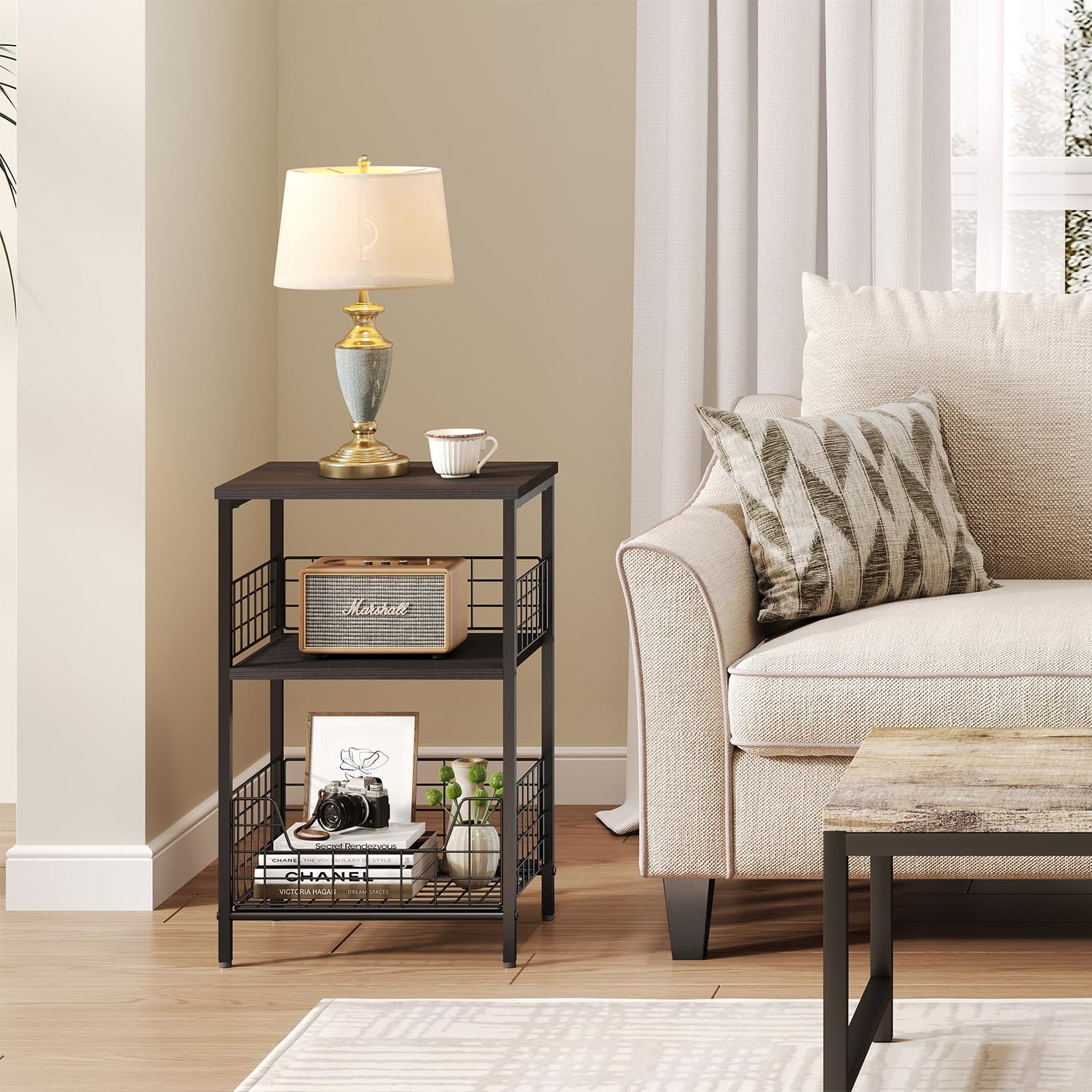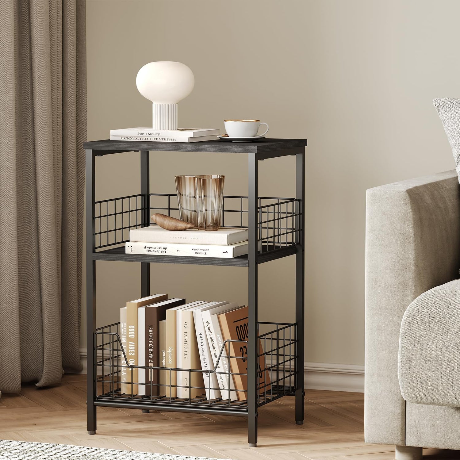 - 【More Practical】3-Tier end table for additional storage meet all of your different needs.The top and middle open smooth shelf gives sufficient storage place for storing and displaying. And the bottom wide U-shape iron wire basket for easy access and can storage snacks,cans or other stuff you want to put inside