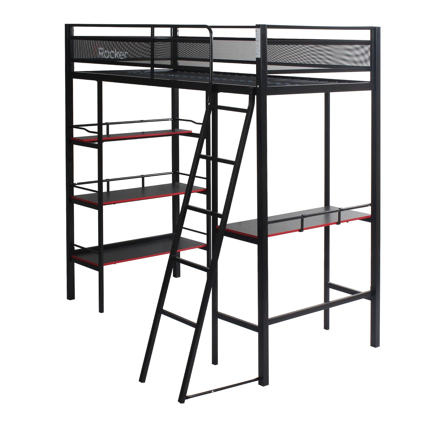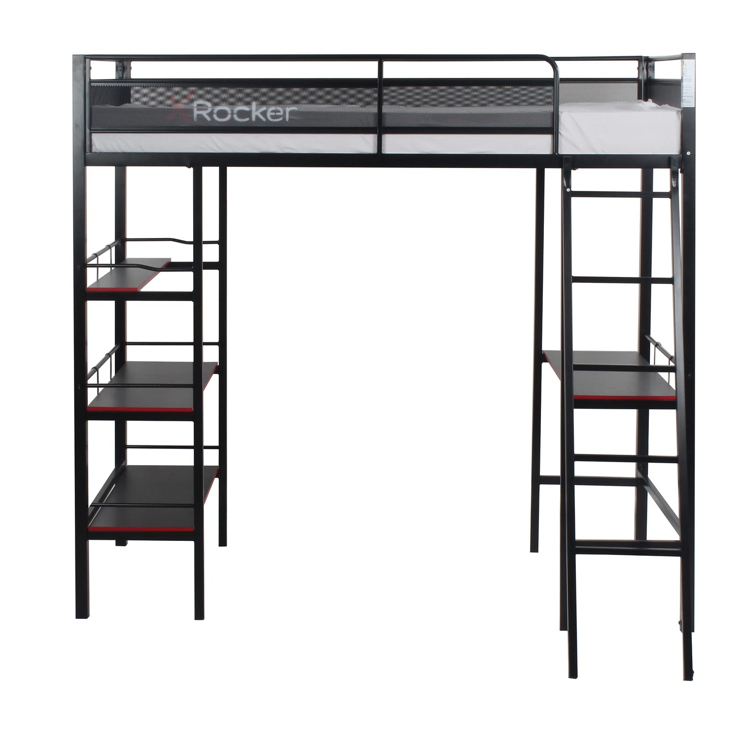 X Rocker Fortress Video Gaming Twin Loft Bed, Durable Black Metal Bed Frame, Built-in Desk and 3 Shelves, 77.64" x 59.17" x 72.05"