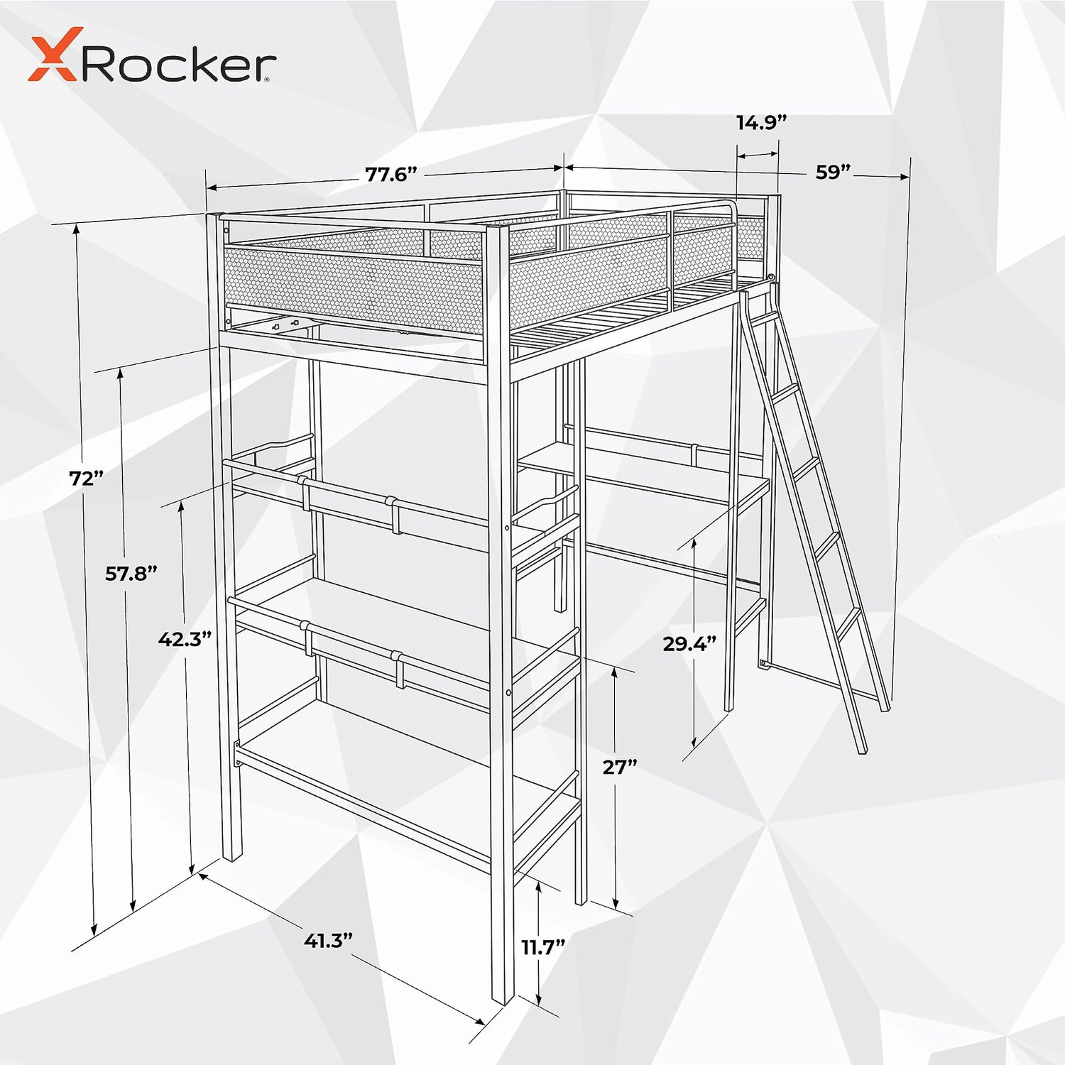 Details: Get ready to conquer the virtual battlefield with the X Rocker Fortress Gaming Bunk Bed. Ideal for gaming, studying, and displaying collectables, the built-in desk features 3 shelves with a smooth carbon fiber effect and red wooden trim. The versatile desk space is spacious enough to hold TVs or PC monitors of up to 40. Pull up an X Rocker gaming chair to create the ideal gaming setup. With a sturdy metal frame and slats, this bed is designed with long-lasting durability in mind. The fixed ladder positioned on the right hand side ensures your child is safe climbing in and out of bed. 77.6 x 59.17 x 72, this twin high sleeper bed is perfectly suited for younger gamers. Founded in 1992, Ace Casual Furniture specializes in furniture designed to fit into your lifestyle. Their top-quality home furnishings are custom made at a price you can afford. The products they use are sourced from around the world, resulting in pieces you can't get anywhere else. Every item they offer combines style and function in an exceptional way.