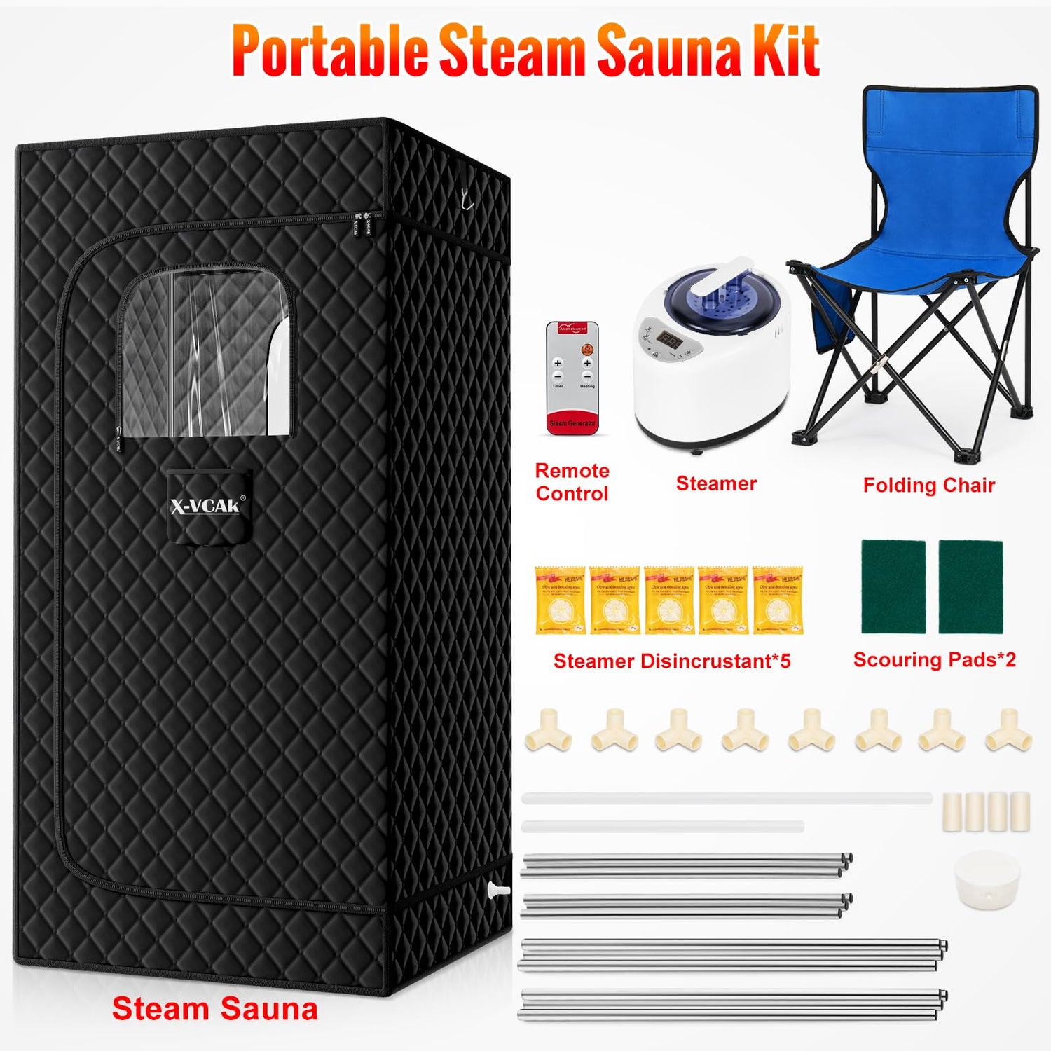 X-Vcak Portable Steam Sauna, Portable Sauna for Home, Sauna Tent Sauna Box with 2.6L Steamer, Remote Control, Folding Chair, 9 Levels, Black, 2.6’ x 2.6’ x 5.9’