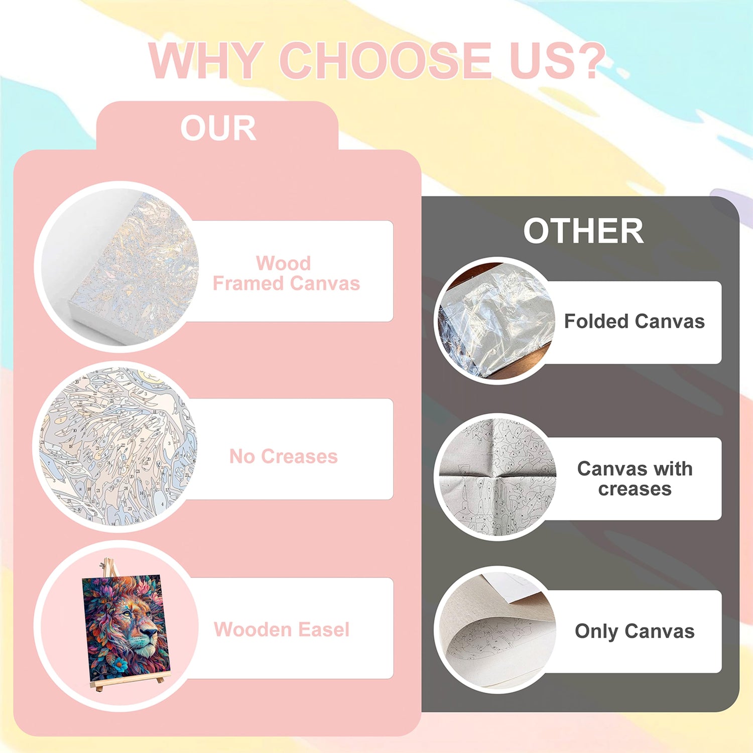- 【HD Color Canvas and Wooden Framed】Unlike normal canvas,we use special hd color canvas. Colored canvases make it easier to distinguish digital areas,and painting for long periods of time doesn't strain the eyes. The canvas is framed (with wooden easel) so that it won't wrinkle. You don't need to buy a separate frame to hang your work where you want. You can also use a wooden easel to place it where you want it to be placed