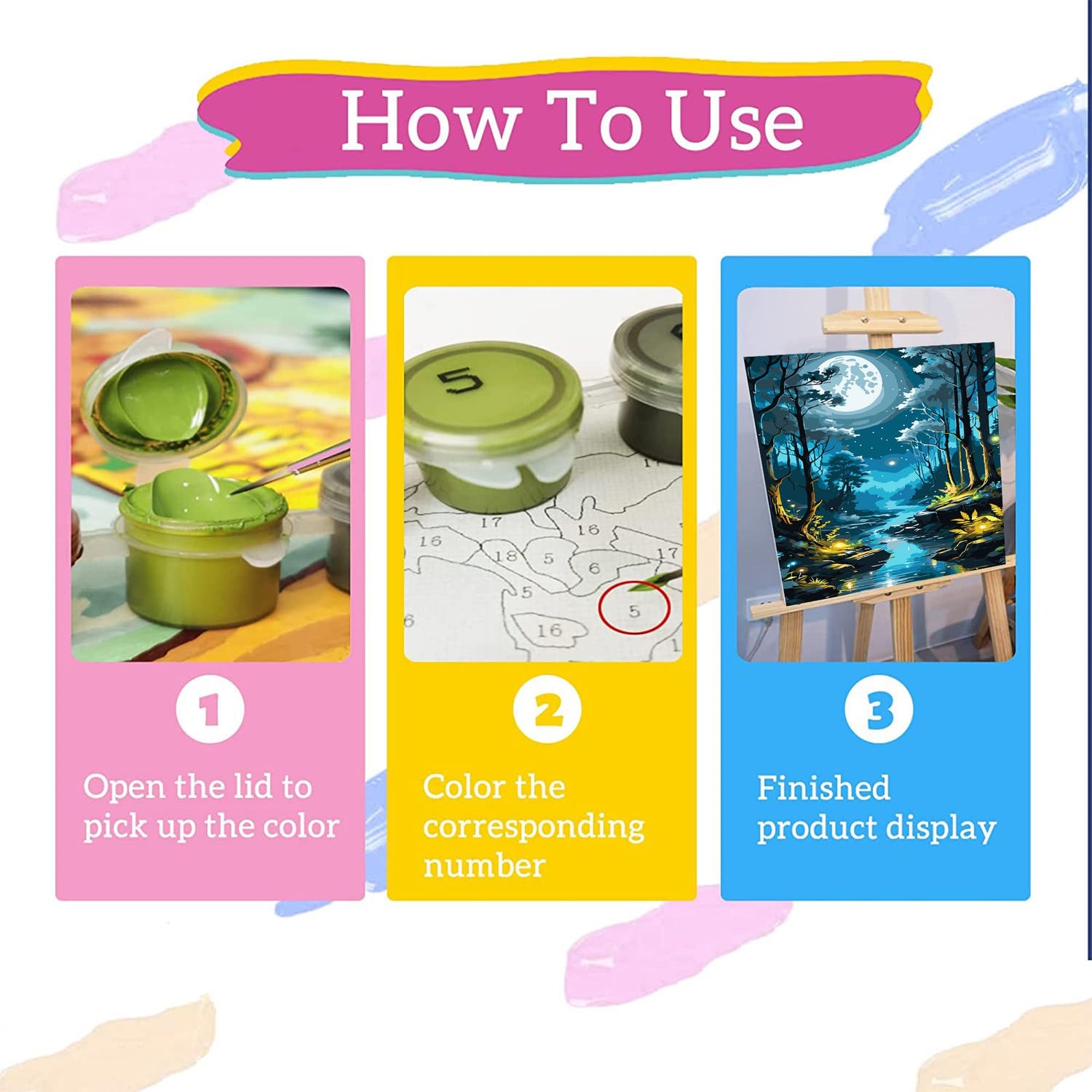 - 【How to Do】 You need match the numbers of the paint and the figures on the canvas to fill in the paint