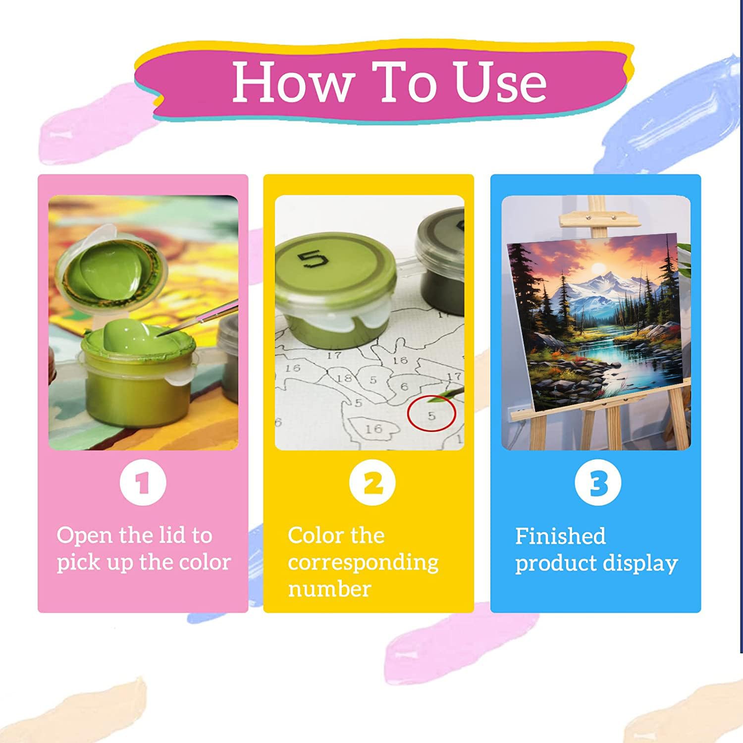 - 【How to Do】 You need match the numbers of the paint and the figures on the canvas to fill in the paint