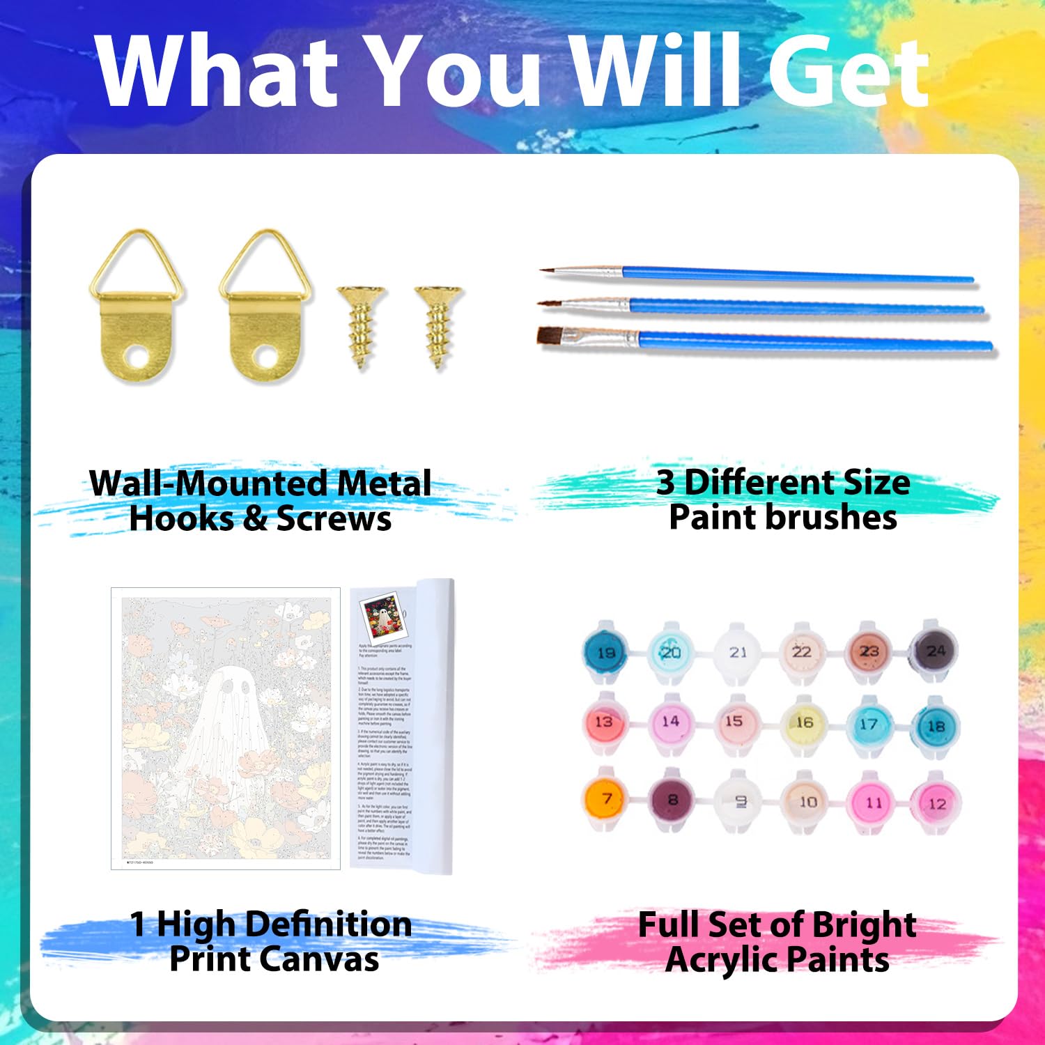 - [Included in the set]: The paint by numbers kit for adults includes: 1 HD printed color canvas, 1 instruction manual, 1 reference map, 1 set of acrylic paints, 3 paintbrushes, 1 set of hooks